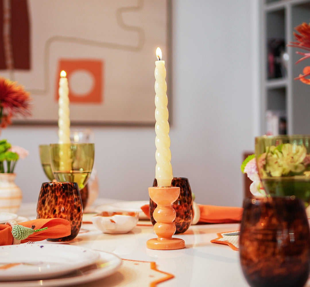 Coloque velas que combinem com o tom de pêssego do castiçal para criar uma atmosfera acolhedora e relaxante em momentos especiais ou no dia a dia.