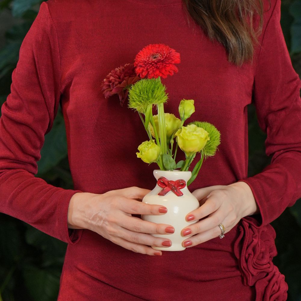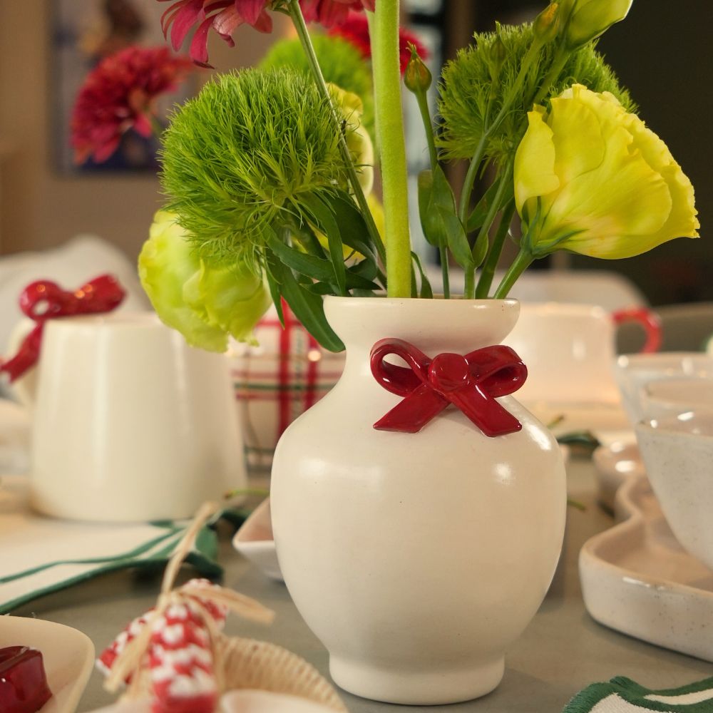 Este vaso de cerâmica pequeno e artesanal é exclusivo Lolahome, em cores branco e vermelho que remetem ao natal