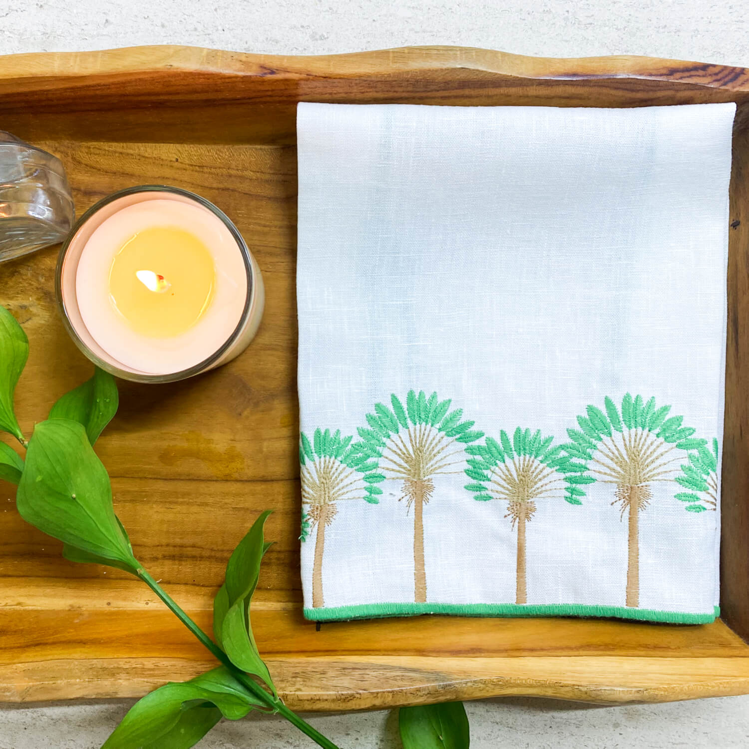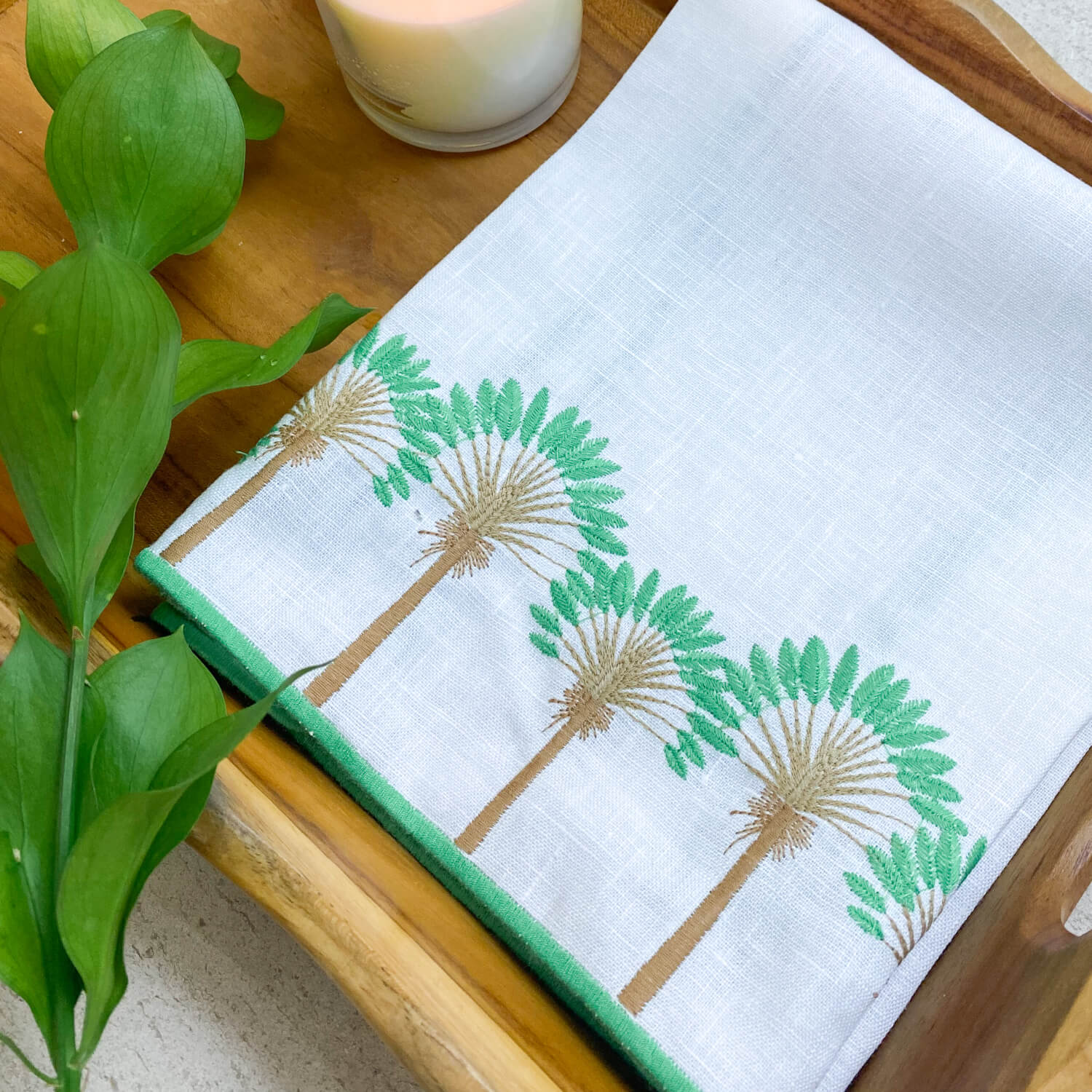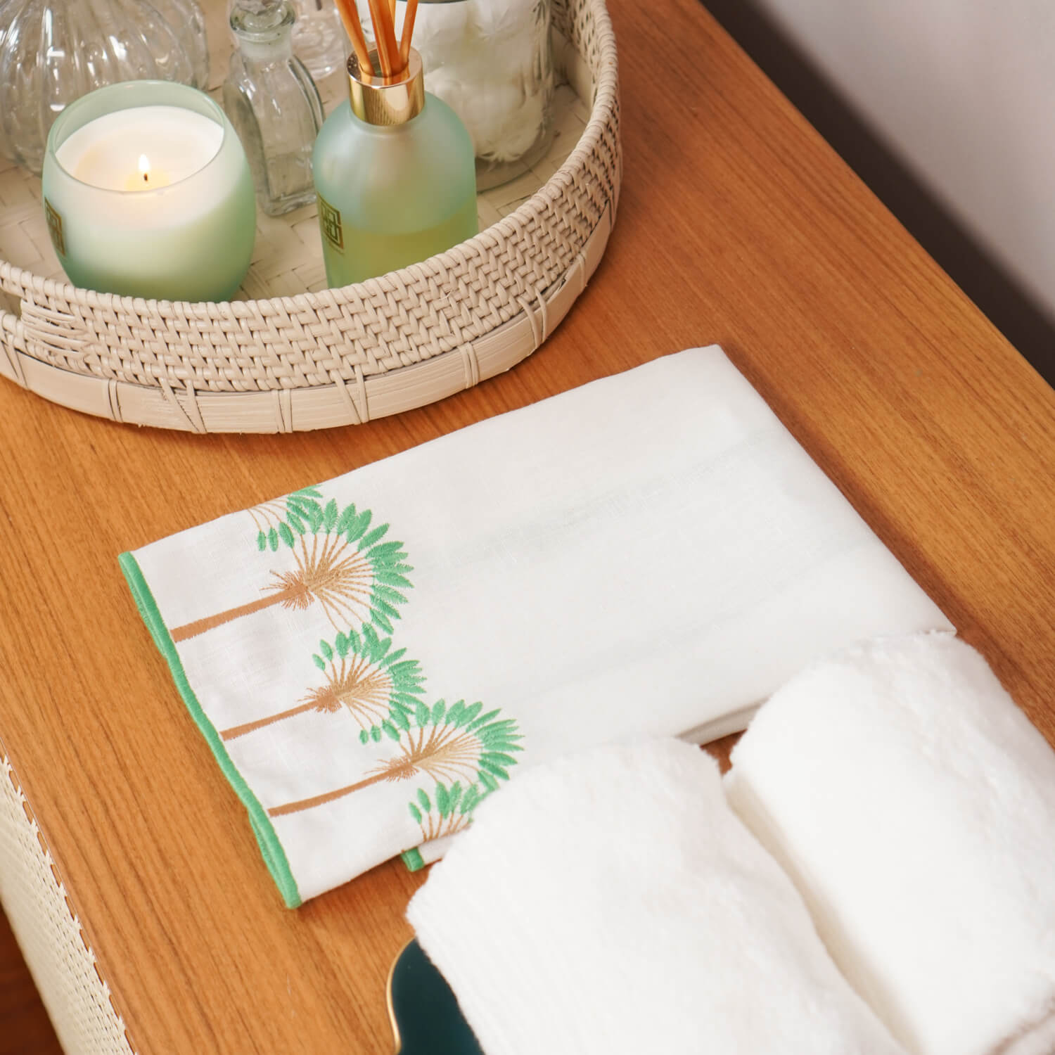 A toalha de lavabo de linho puro palmeira é o que faltava para trazer cor para seu lavabo. Sabemos que cada cantinho da nossa casa merece produtos de ótima qualidade e que quando recebemos pessoas especiais, elas sentem o carinho em cada detalhe, por isso a Toalha de lavabo Palmeira é a peça ideal, pois é sofisticada, moderna e exclusiva. Ela é toda bordada em sua volta e as palmeirinhas também, com certeza você irá se apaixonar.