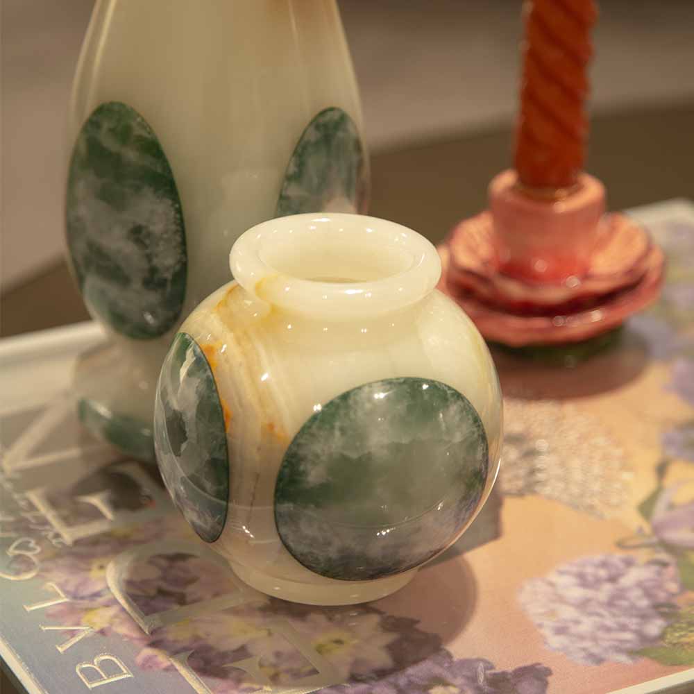 Coloque-o em mesas de centro, prateleiras ou estantes para adicionar um toque sofisticado. Para um visual mais natural, utilize plantas de pequeno porte ou suculentas dentro do vaso, garantindo que haja um recipiente interno para facilitar a rega e proteger o ônix. O design esférico do vaso permite a criação de arranjos florais criativos, sejam eles de flores frescas, secas ou artificiais. Combine-o com outras peças decorativas, como velas, livros ou outros vasos da coleção Ônix, para compor um ambiente harmonioso e atraente.