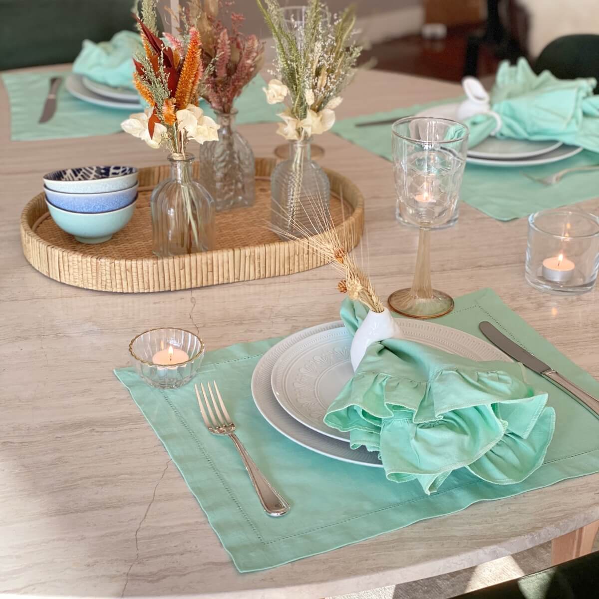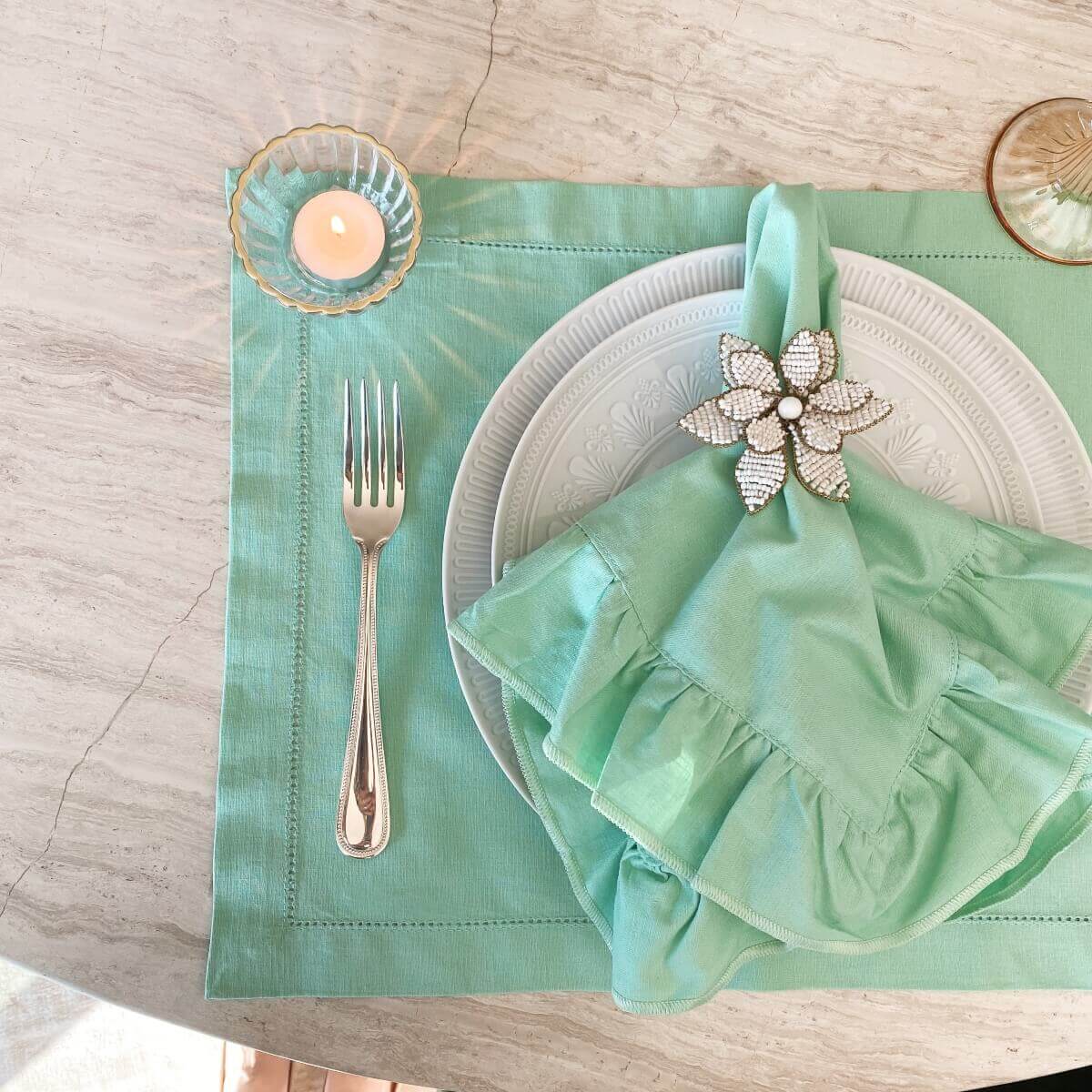 Com tom suave e acolhedor, o Guardanapo de Linho Visco com babado verde menta é uma peça original e super especial.