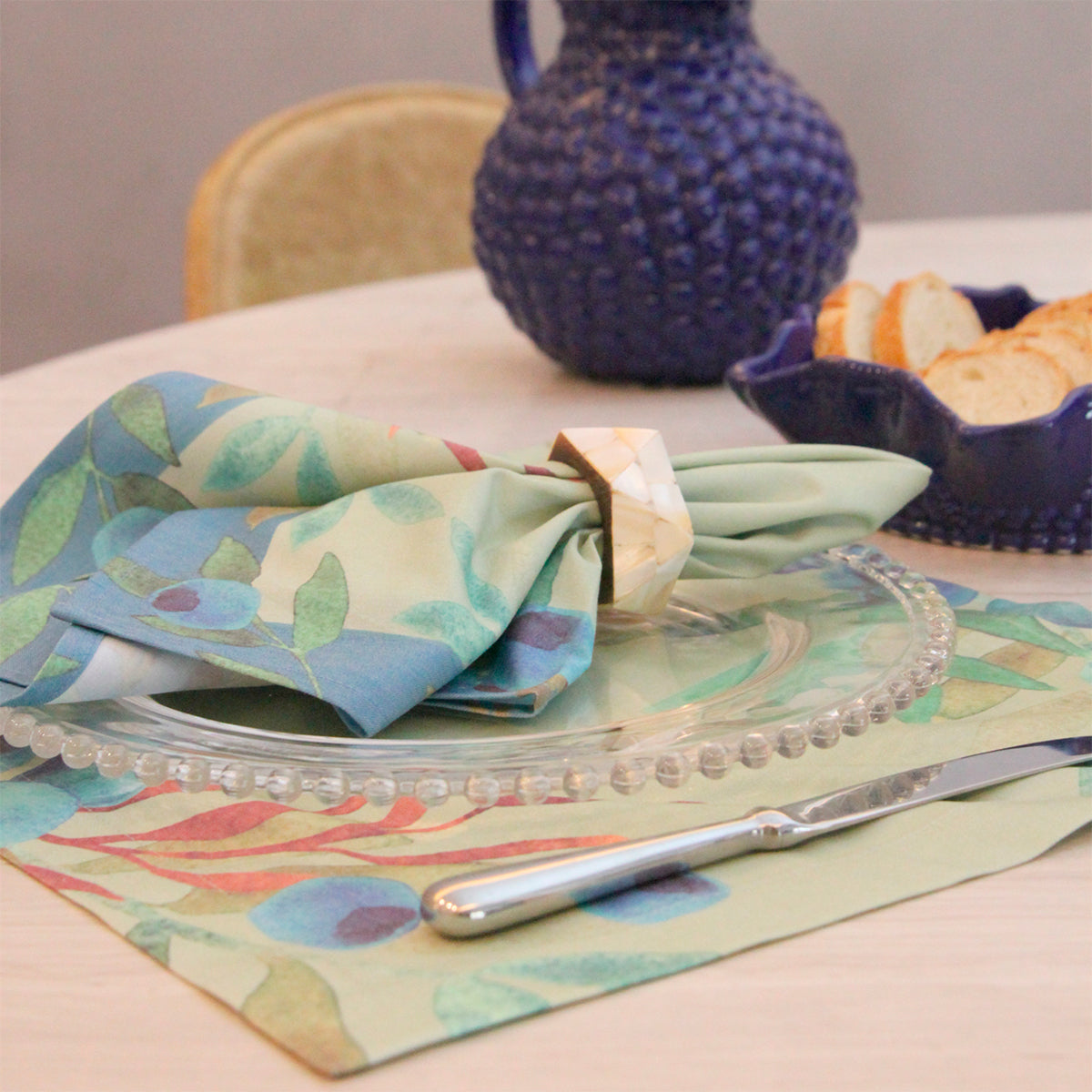Só de pronunciar a palavra "Blueberry", já dá para sentir a união entre sofisticação e a delicadeza solta no ar, e é exatamente esse aspecto que suas refeições ganharão ao decorar sua mesa posta com o Jogo Americano Blueberry. Os tons de azul e verde usados para estampar a peça são de um encanto único, e o efeito aquarelado deixa o Jogo americano mais primoroso ainda! Se combinado com o guardanapo Blueberry e com o porta guardanapo madrepérola, vira o composé ideal para um jantar memorável em uma noite de verão.