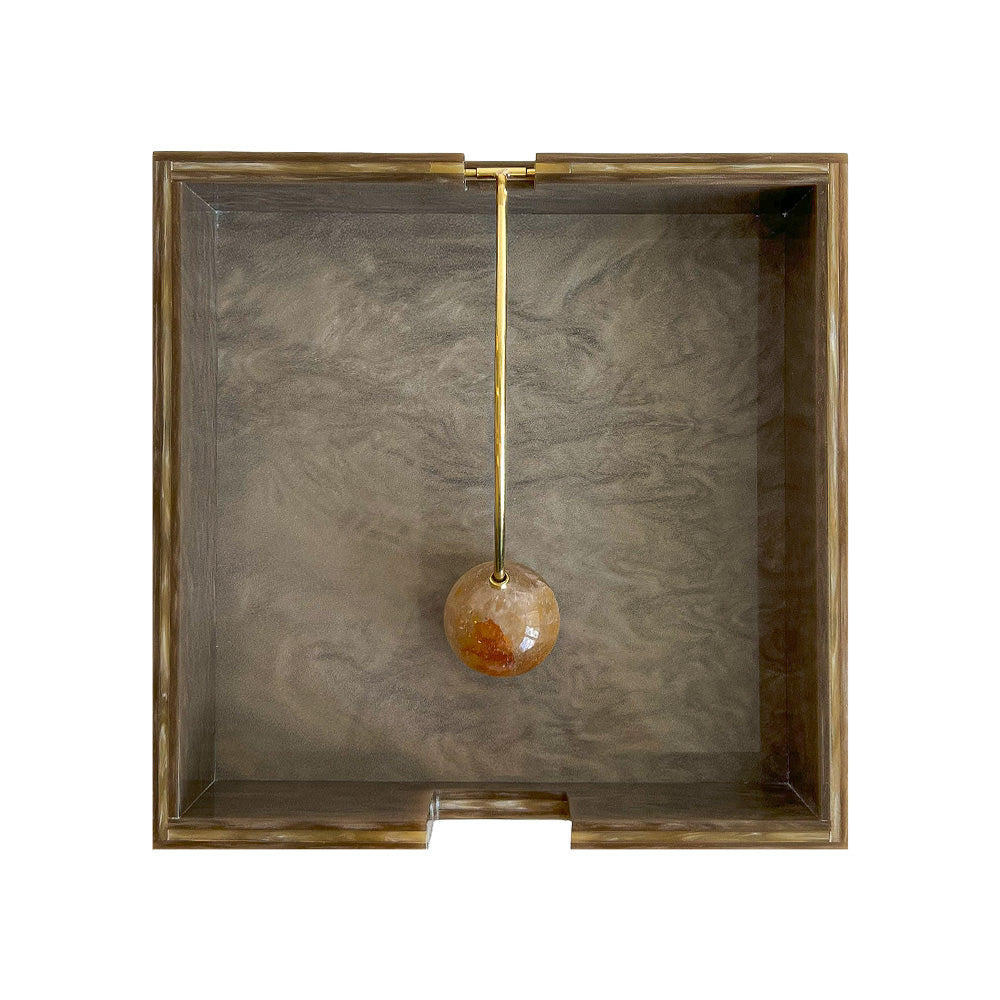 Feito em acrílico na cor fendi, com um detalhe em formato de esfera em quartzo hematóide, e latão banhado a ouro,