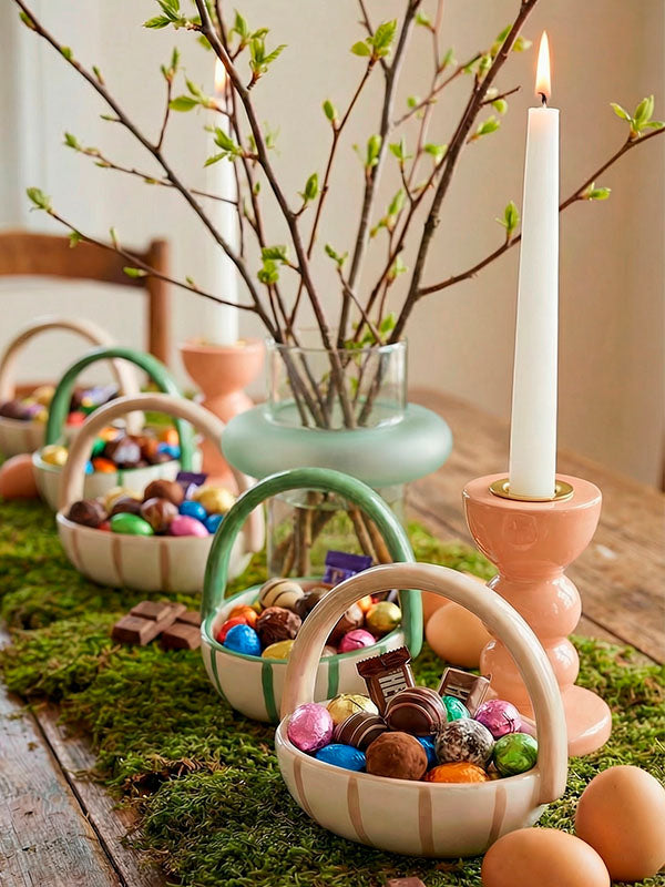 A Cestinha de Cerâmica Listras Bege é um must have para sua Páscoa! É super versátil, pois você pode usar tanto na decoração da mesa, quanto da casa. Use para servir aperitivos, ou então cheia de ovinhos e balinhas decorando a mesa.