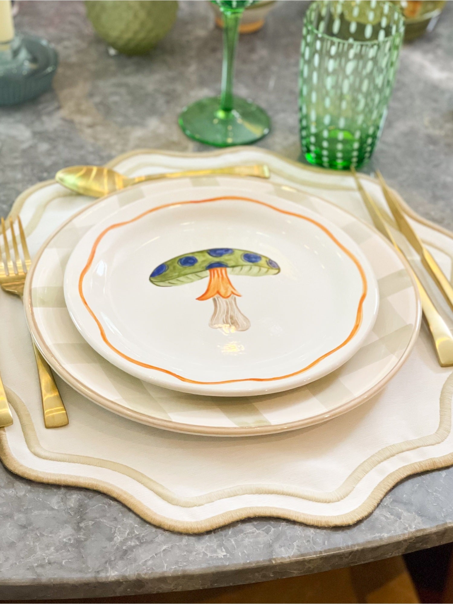 Para a mesa, pratos rasos em padronagem xadrez e pratos de sobremesa pintados em três variações, para usar tudo misturado e deixar a composição cheia de bossa e movimento!