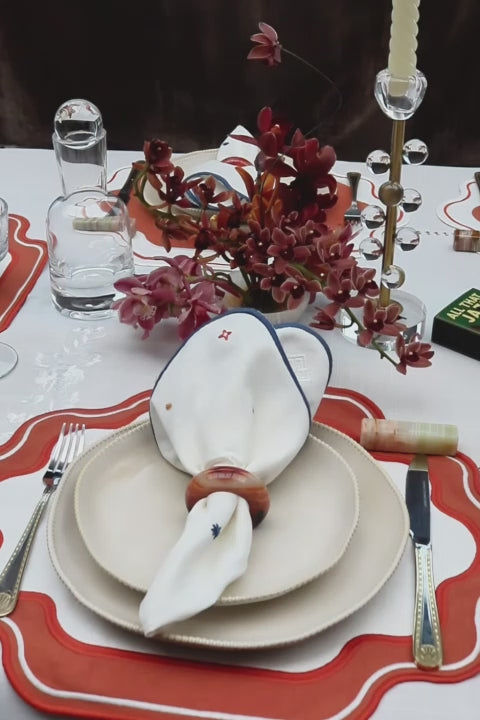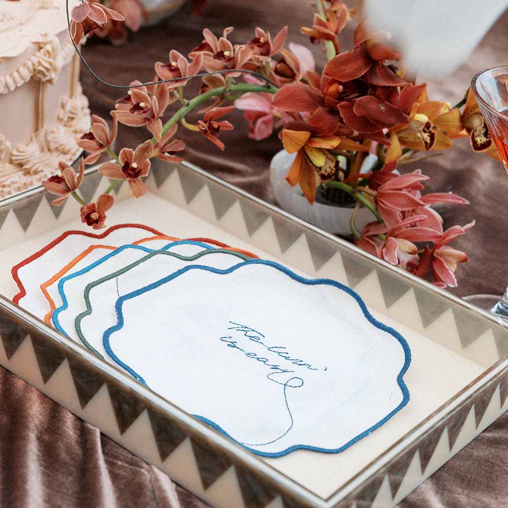 Os jogos americanos, com formas orgânicas, lembram as ondas sonoras que fluem das grandes bandas que marcaram a época. Os guardanapos e guardanapos de coquetel recebem um toque especial com elementos icônicos dessa era mágica.