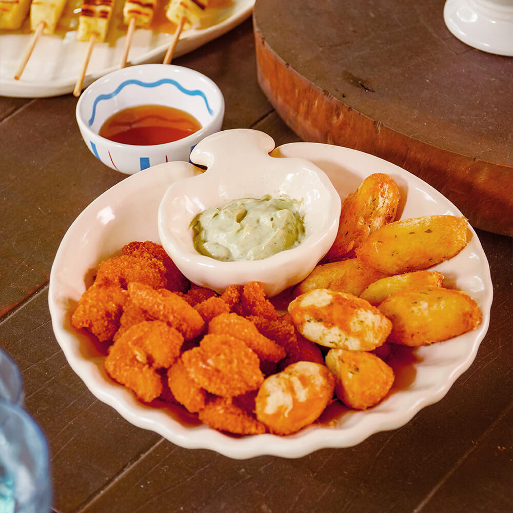 No prato raso, uma padronagem que segue a linha orgânica e leve nos mesmos tons. Os bowls com o nome da coleção e a molheira, trazem ainda mais charme para a linha.