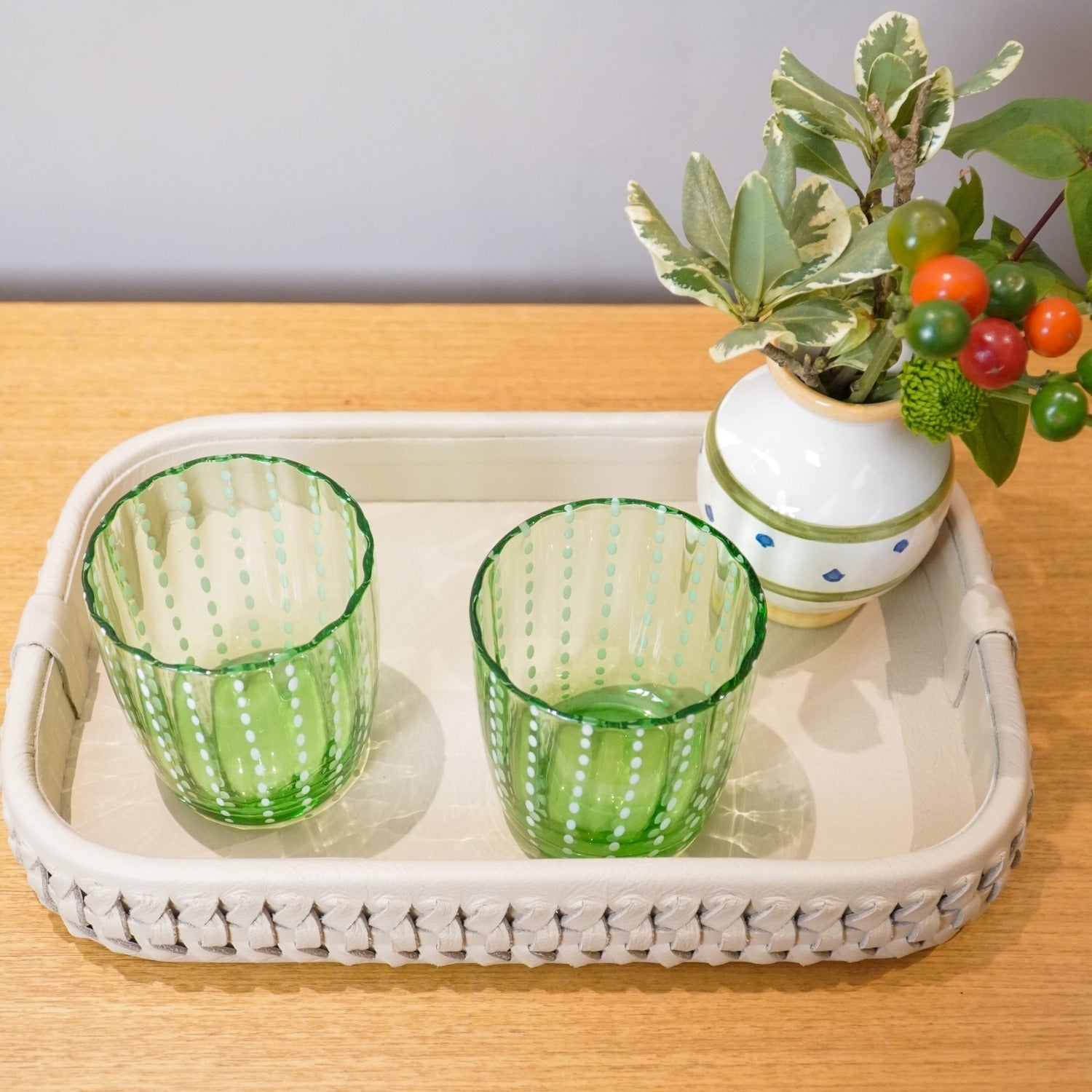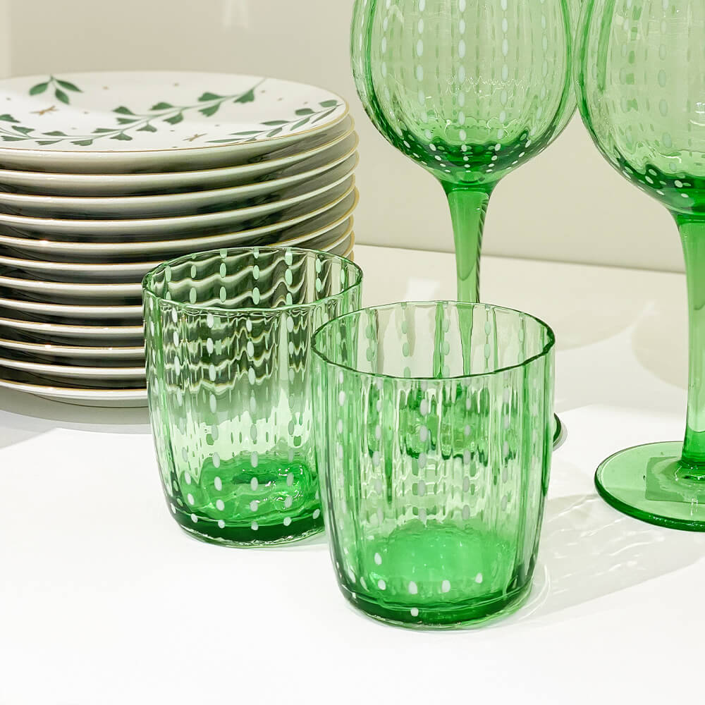O copo baixo dots verde é a pedida certa para você que não abre mão de peças com personalidade para compor a mesa, já que seu tom de verde é vibrante, e tem bolinhas brancas em toda sua volta, dando um charme único para peça. Além disso, ele é versátil e pode decorar não só a mesa, é perfeito para decorar o bar.