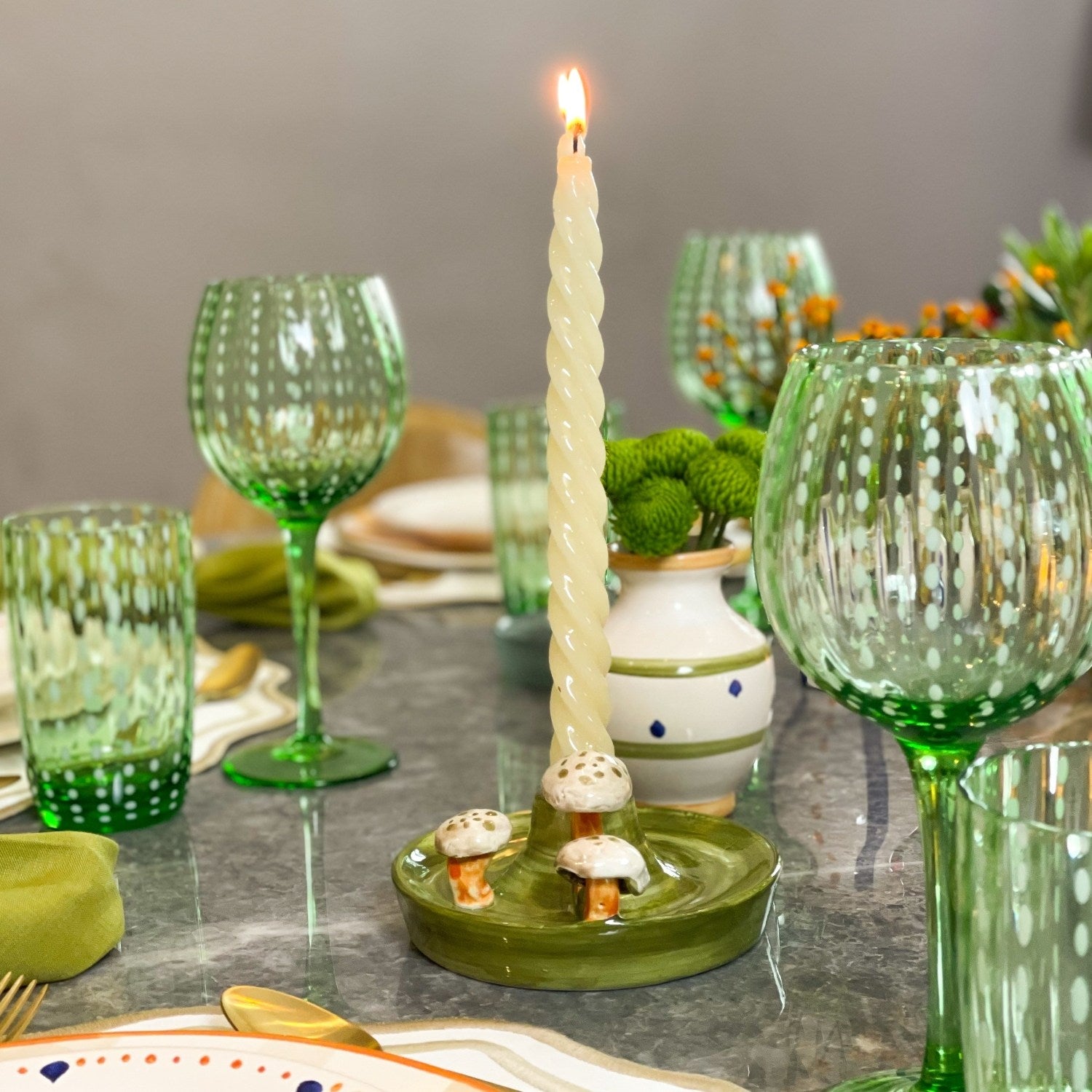 Na hora de montar sua mesa, use seu copo baixo junto com o copo alto, aposte na combinação com jogos americanos easy clean e guardanapos verdes, a dica é usar algumas peças mais rústicas para um mix bem legal, complete com porta guardanapos de fibras naturais, castiçais de madeira e para as velas, opte por tons de marfim e verde.