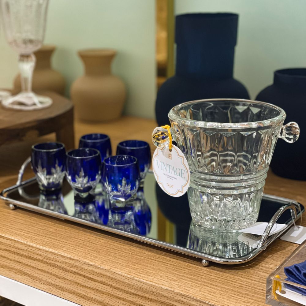 Desfrute de uma atmosfera vintage com o Conjunto de Copinhos de Licor, produzido em cristal azul, a delicadeza da estampa, inspirados na década de 80 na Itália.