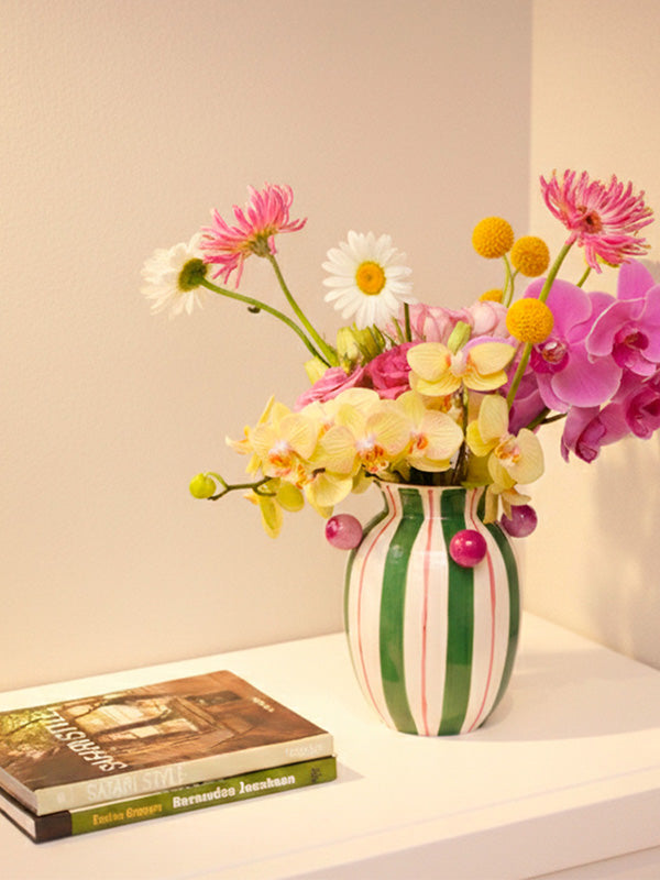 Vaso de Cerâmica Artesanal Lolahome, Grande (20cm), um produto Autoral e Exclusivo feito no Brasil. Com 4 pedras de Ágata, ele traz Elegância e Design Único em tons de Verde e Rosa para qualquer ambiente.