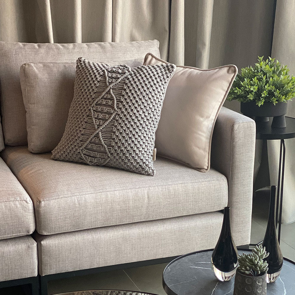 Você pode usar sua almofada de macramê no sofá em composição com outras almofadas de tricot ou almofadas de veludo, e também na cama coordenadas com outras almofadas. O cinza é super neutro e portando fácil de combinar!