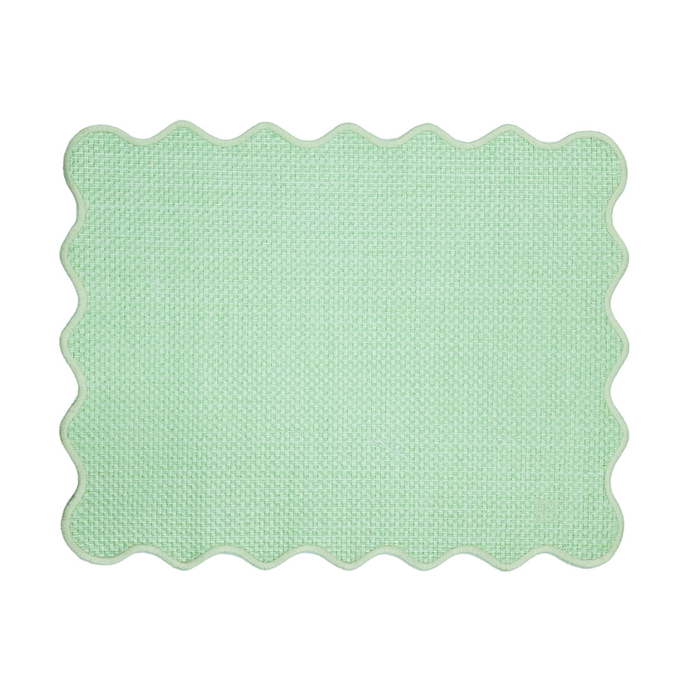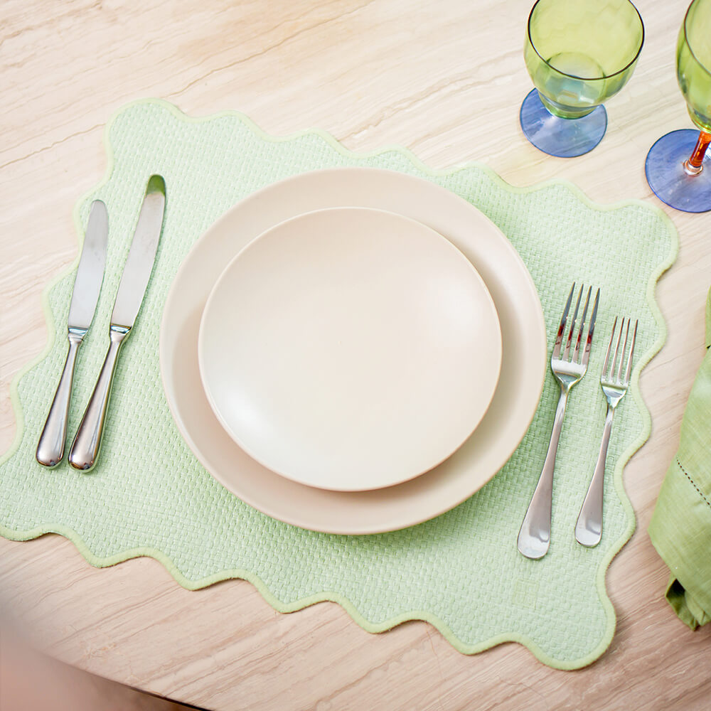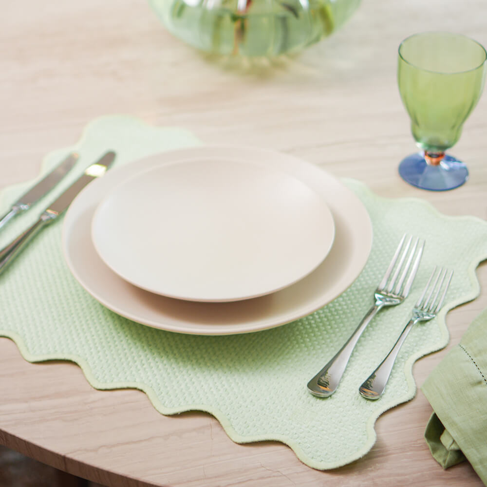 Use o tom verde do jogo americano para criar um contraste vibrante com louças em tons claros, como branco ou bege. Esse contraste realça tanto a peça quanto os utensílios, dando destaque à mesa.
