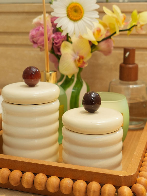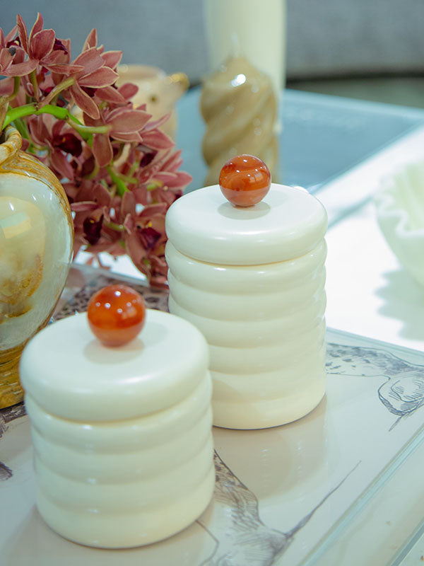 Este pote de cerâmica autoral da Lolahome é uma peça funcional e elegante para a sua decoração. Com sua tampa de pedra de ágata natural, ele traz um toque de sofisticação e se destaca pela sua versatilidade.