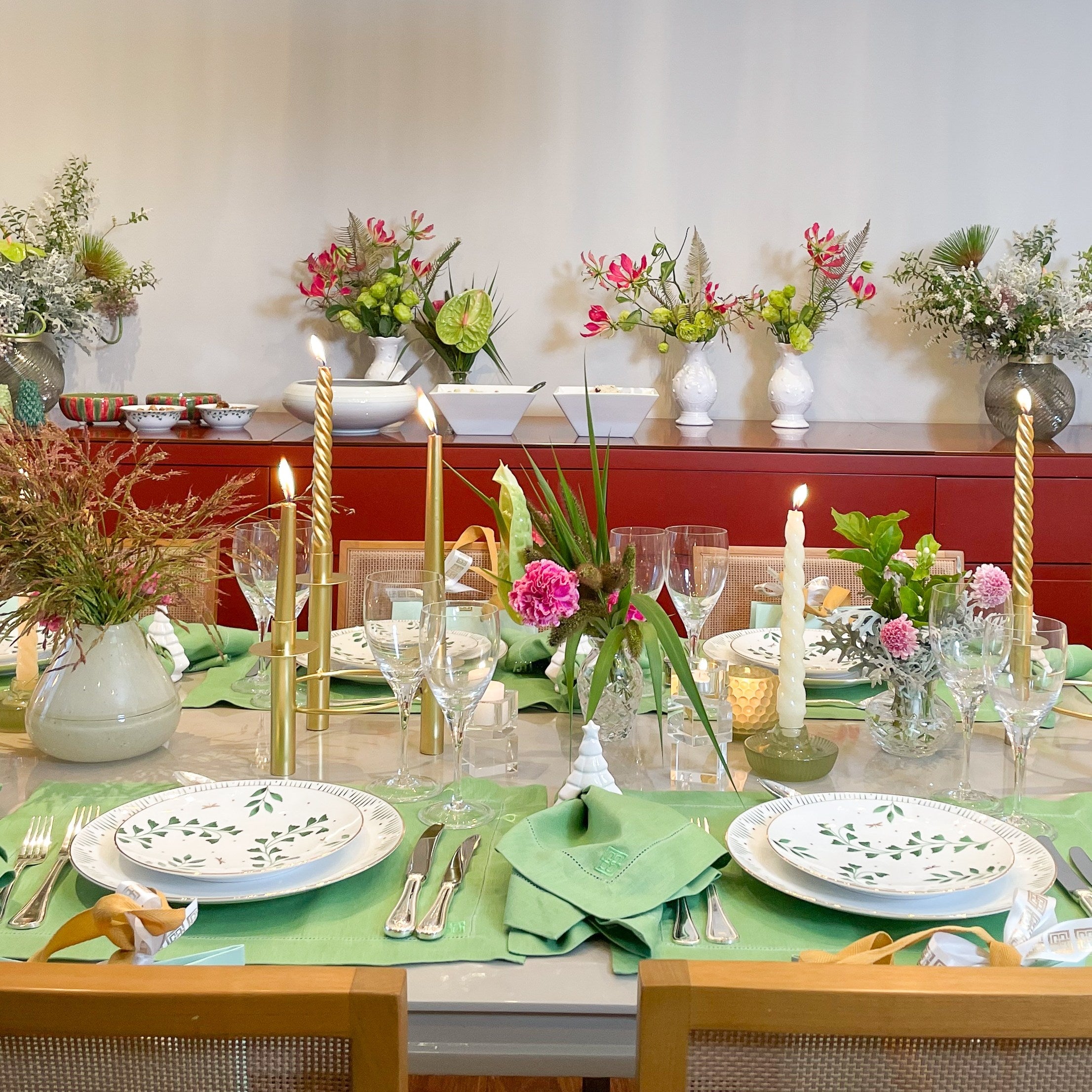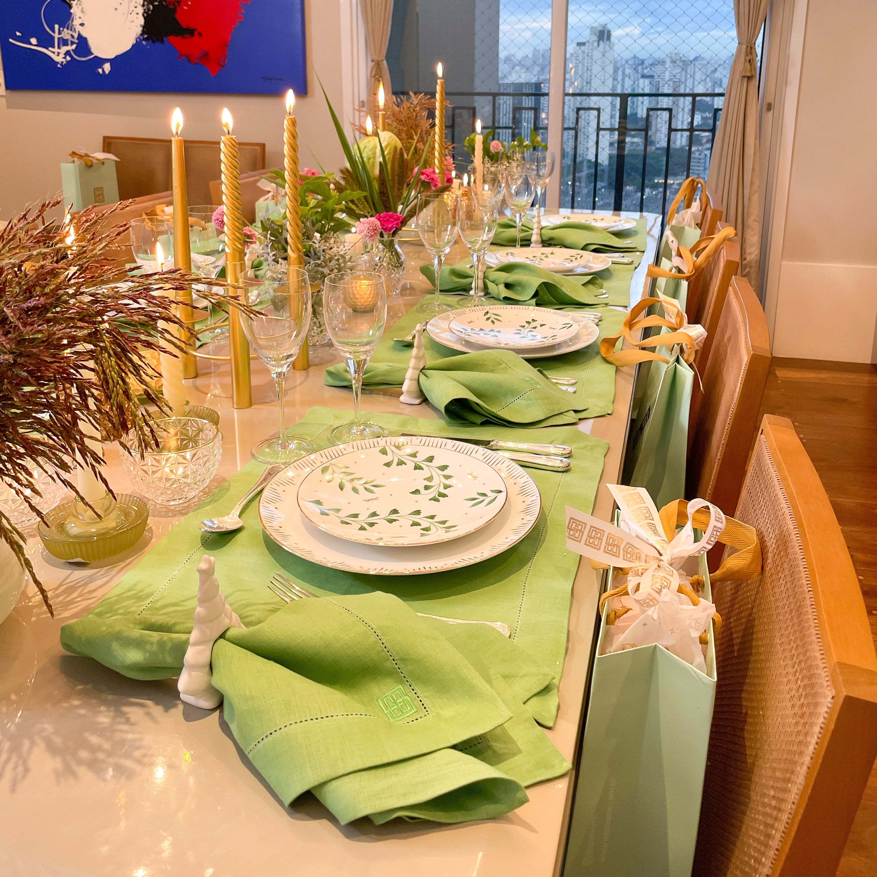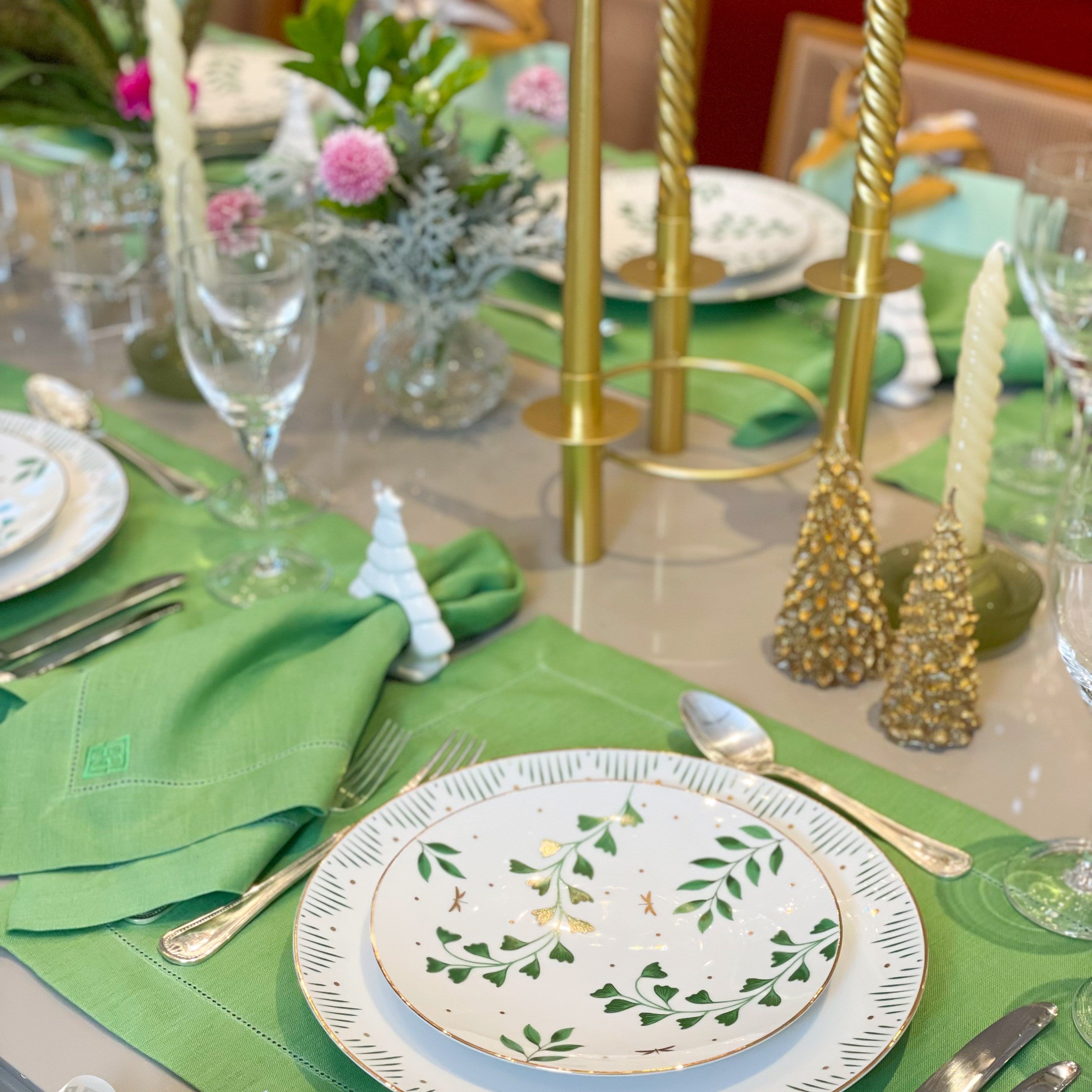Você poderá combinar seu jogo americano de linho verde folha com o guardanapo da mesma coleção, e caprichar nos detalhes natalinos, como porta guardanapos de azevinhos e velas com castiçais para brilhar ainda mais sua noite.
