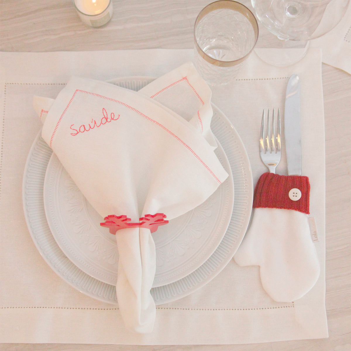 Feita com o toque macio do sued e acabamento delicado do tricot, ela acomoda os talheres com muito charme para trazer todo o espirito natalino para sua mesa posta.