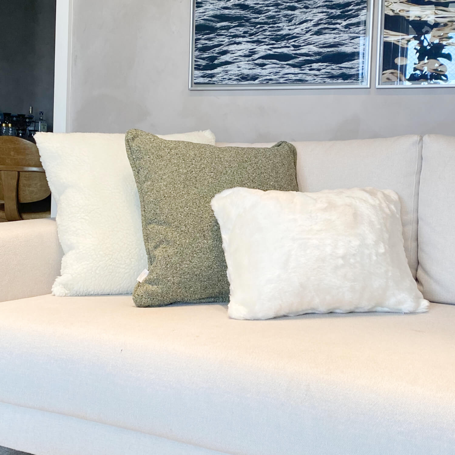 Para compor a decoração da casa, coordene sua almofada Boucle com almofadas de tricot e outros tecidos na mesma paleta de cor, e para brincar com tamanhos, use a Almofada Bouclé retangular. Essa combinação fica super charmosa e elegante.