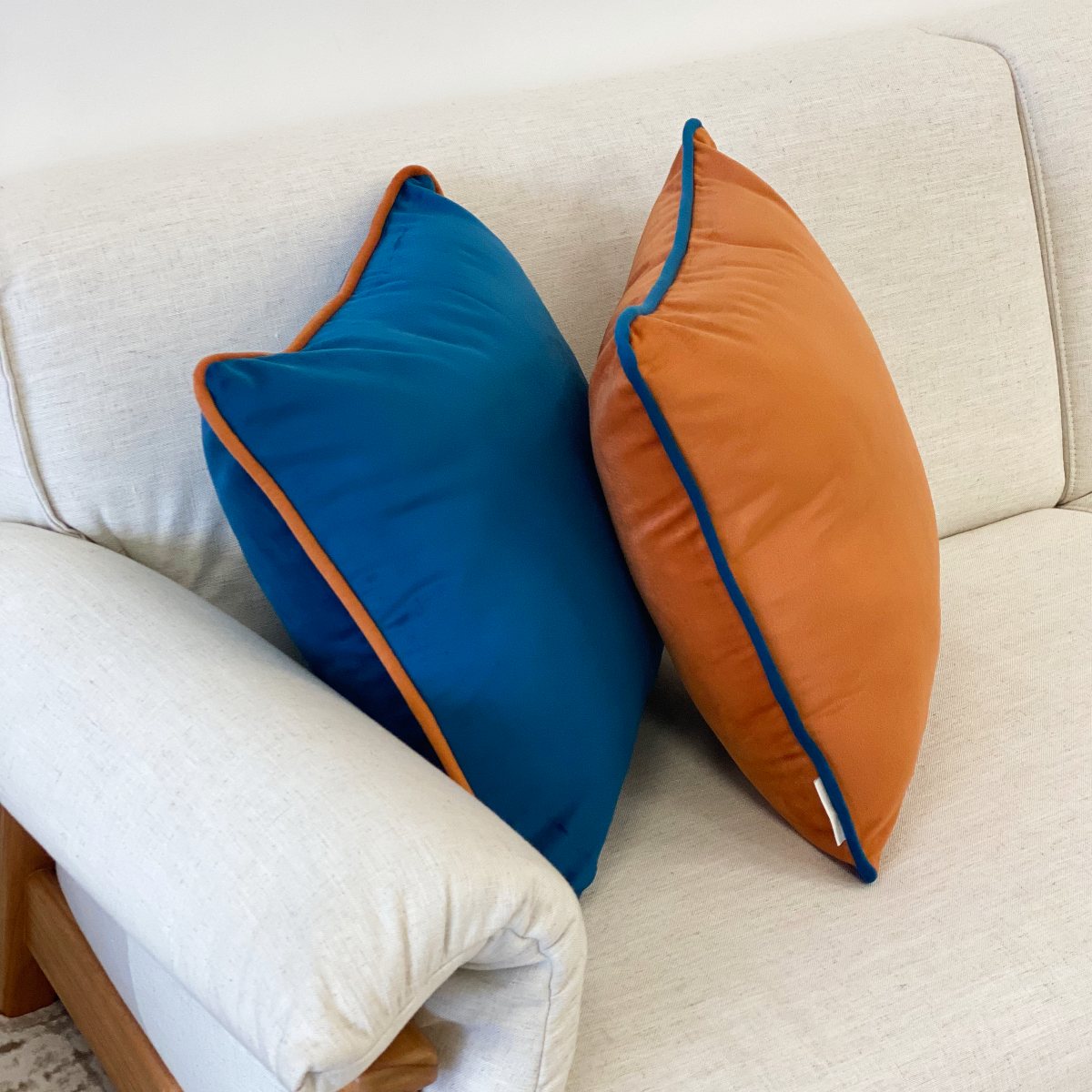 CAPA DE ALMOFADA VELUDO LINES COM VIVO LARANJA COM AZUL 50X50 CM