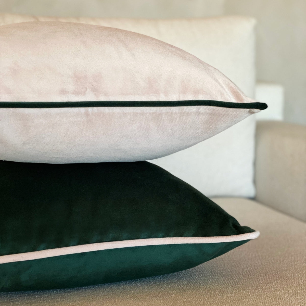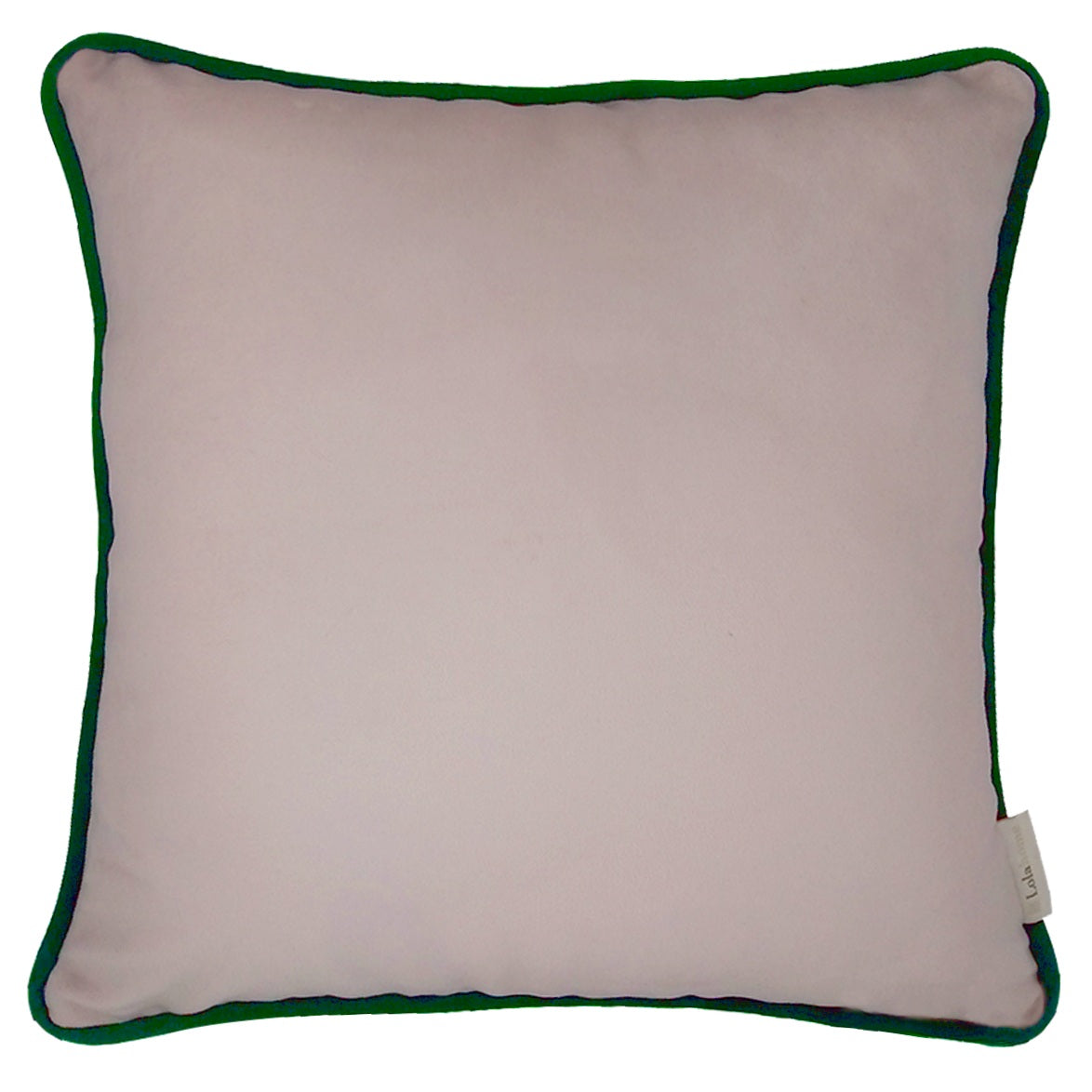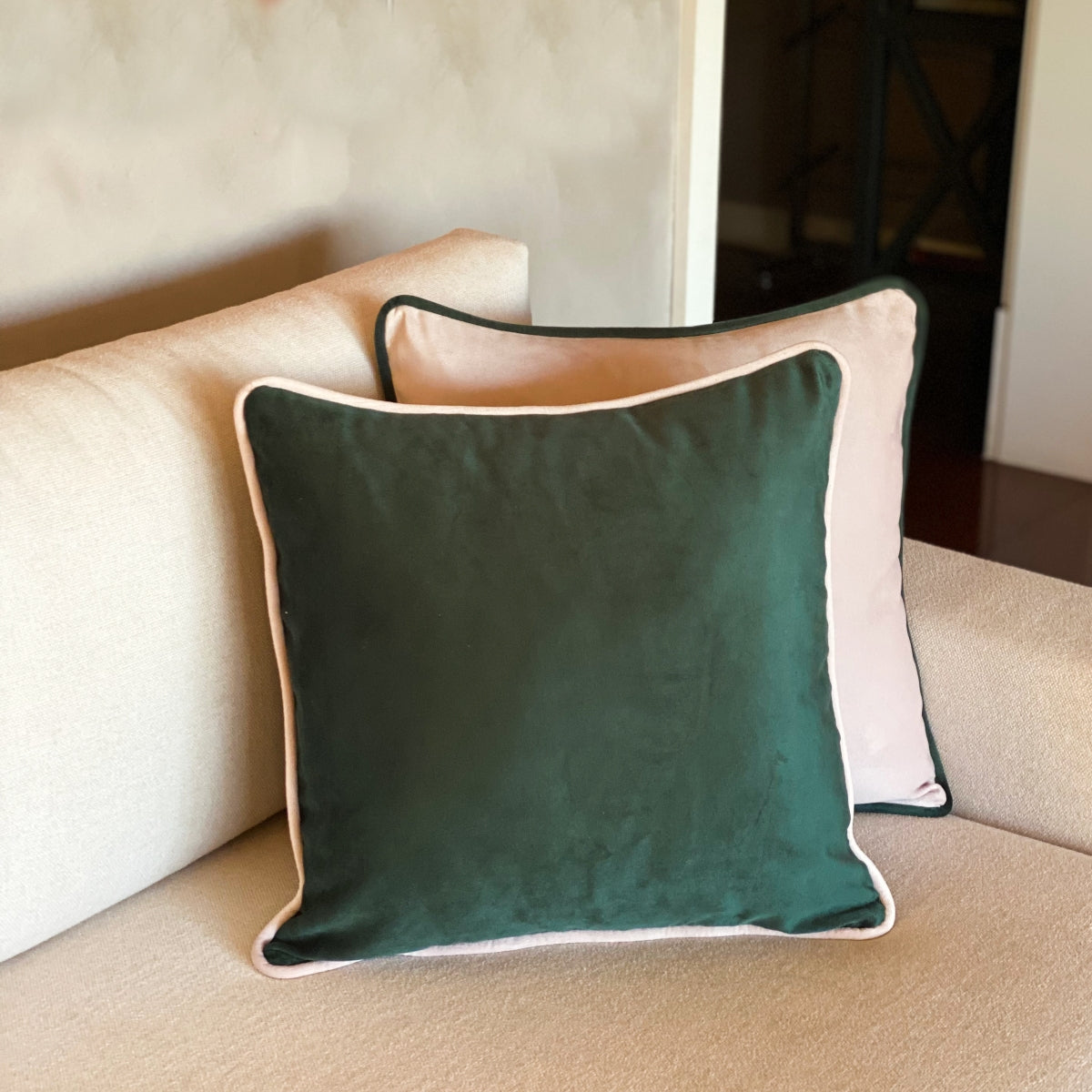 CAPA DE ALMOFADA VELUDO LINES COM VIVO ROSA E VERDE 50X50 CM