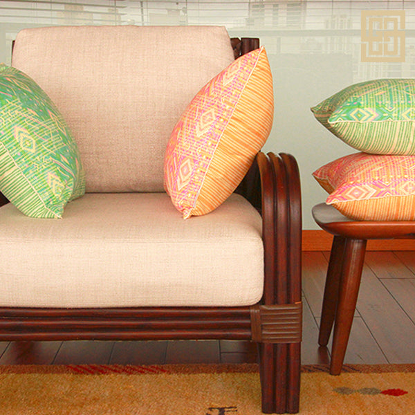 Como as estampas são diferentes na frete e no verso, você pode combinar mais de uma almofada Karo usadas de lados opostos.