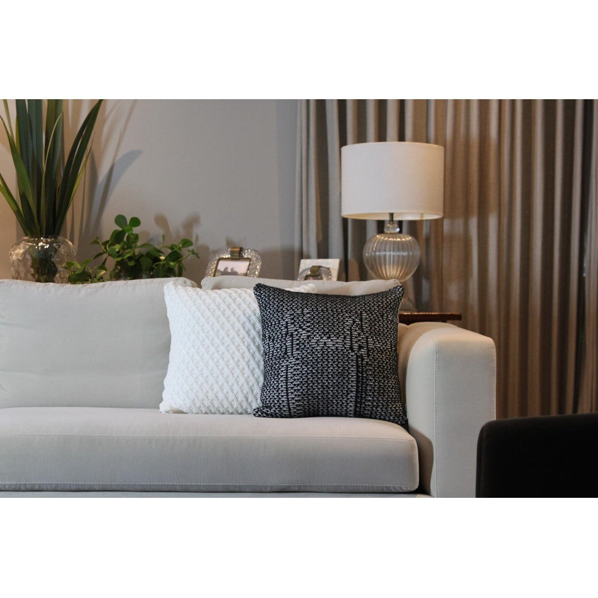 A mistura dos dois fios em tramas irregulares traz à almofada um aspecto imperfeito, feito à mão e enaltece uma estética rústica e natural.