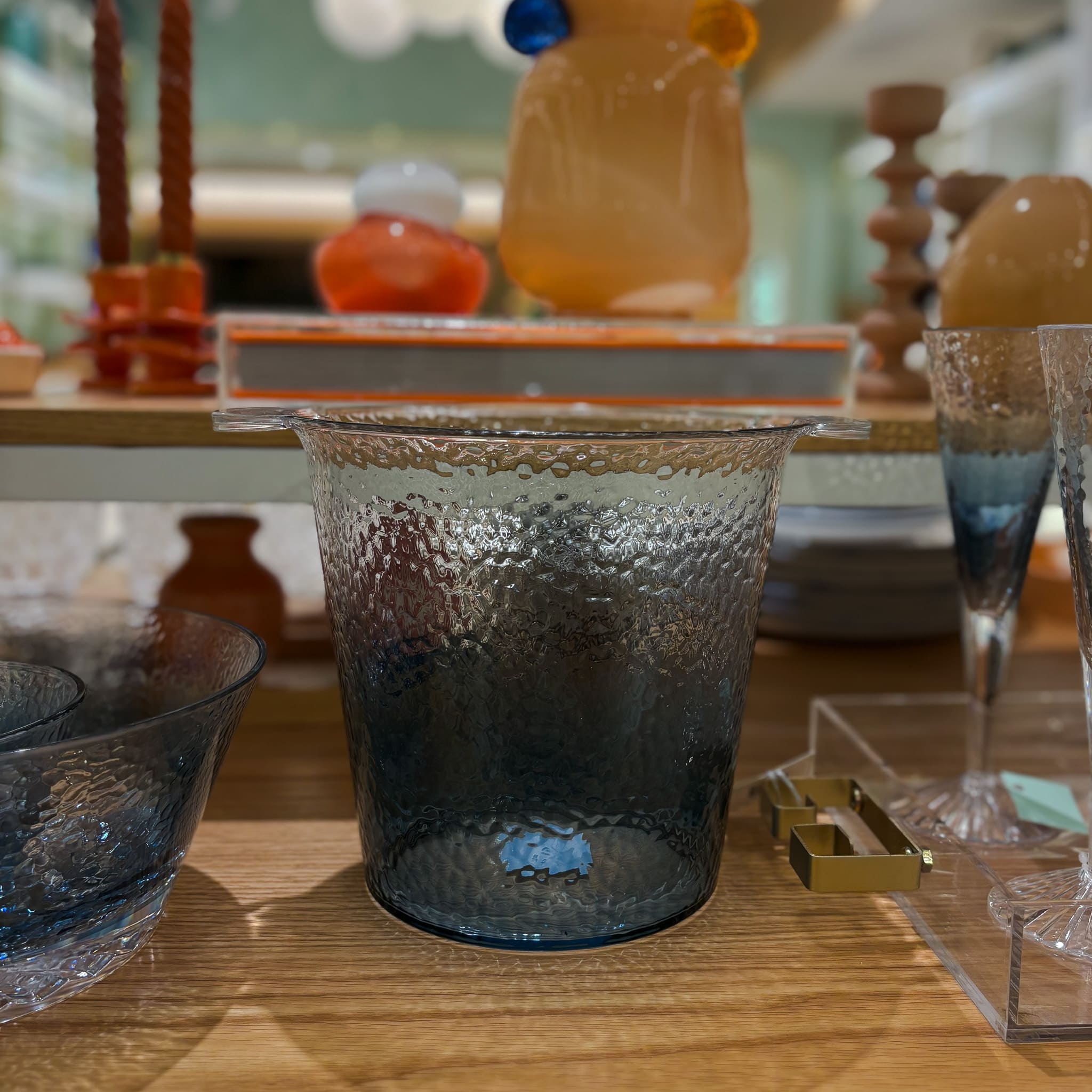 A champanheira de acrílico prisma azul é um utensílio de bar prático e versátil, ideal para manter as bebidas geladas durante seus encontros com amigos e família. Seu design moderno com textura dá um toque especial à sua mesa posta e a sua cor azul vibrante adiciona personalidade à decoração. É leve, resistente e perfeito para todos os momentos.