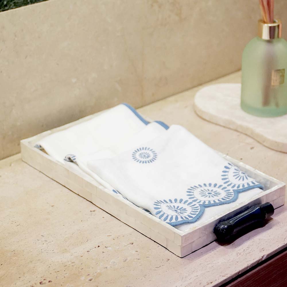 A madrepérola é um material delicado e sensível, por isso requer atenção especial. Use pano macio e limpo levemente umedecido com água morna. Evite o uso de produtos químicos abrasivos ou materiais ásperos que possam arranhar a superfície da madrepérola. Evite expor sua bandeja de madrepérola à luz solar direta por longos períodos, pois a luz intensa pode causar descoloração gradual ao longo do tempo.