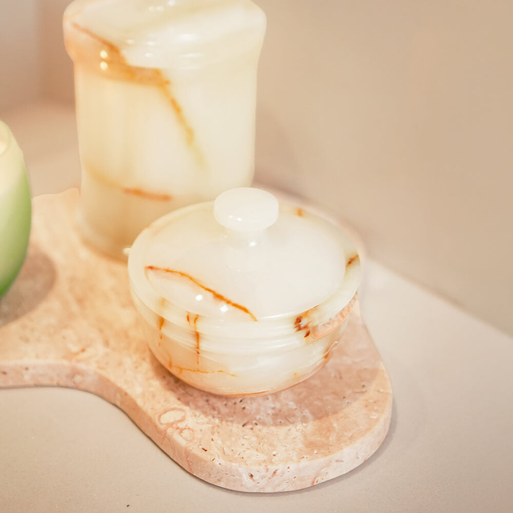 Você pode usar essa linda peça de ônix para compor ambientes de várias maneiras. Além de ser um elemento decorativo, pode funcionar como um dispenser para acessórios e joias, trazendo elegância ao ambiente. Sua textura e cor únicas adicionam um toque sofisticado, tornando-a perfeita para organizar pequenos itens. Com criatividade, essa peça se torna uma aliada na decoração e na funcionalidade do espaço!