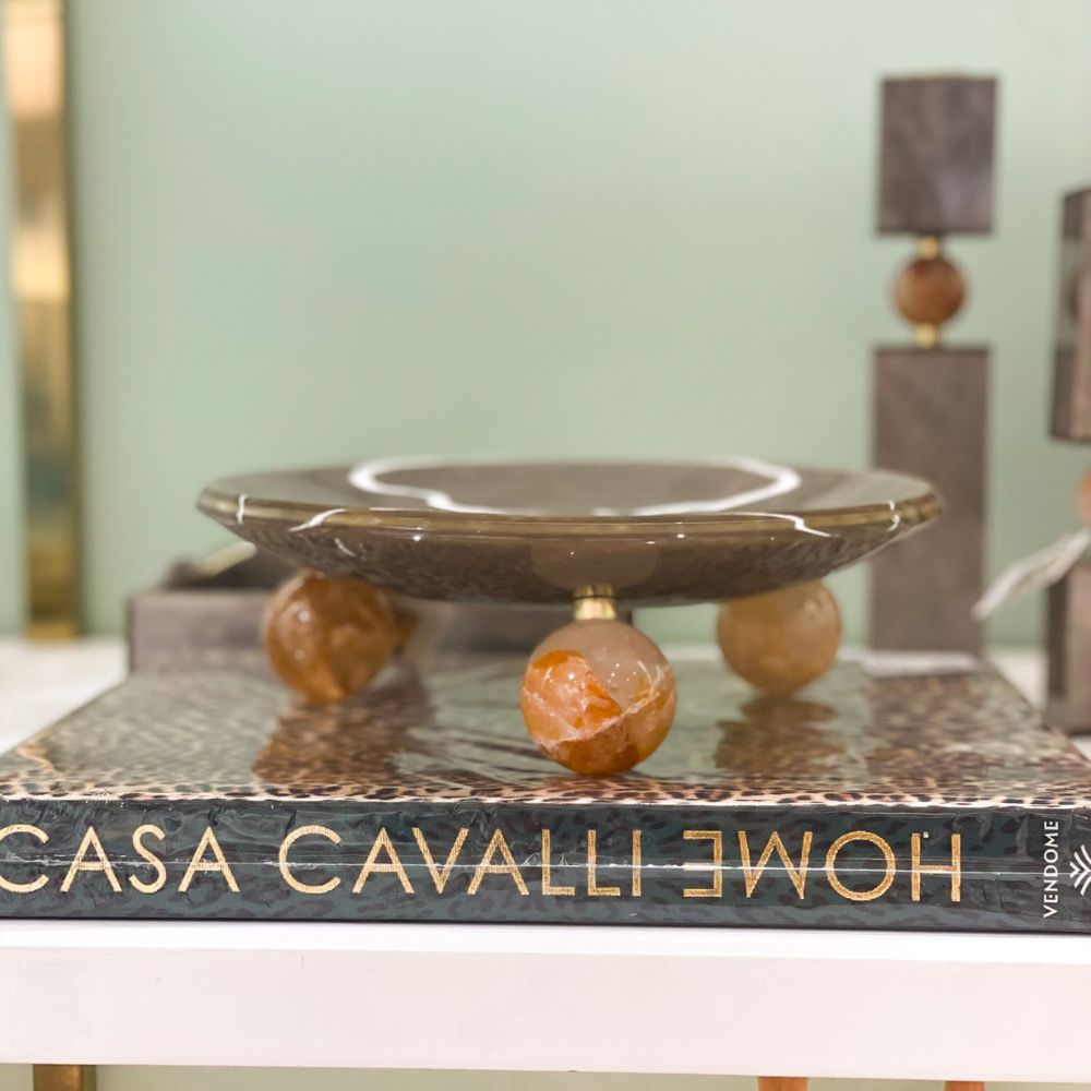 Com pés em formatos de esfera em quartzo hematóide e com detalhes dourados.