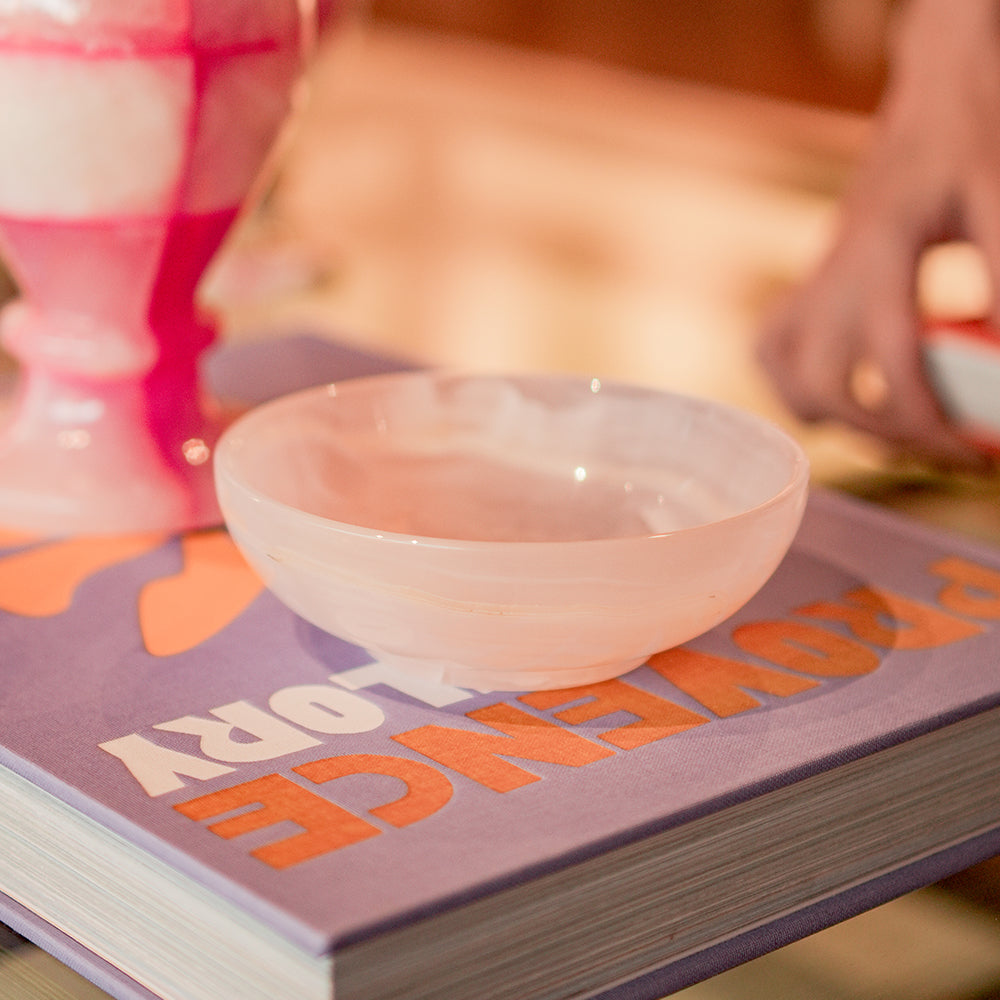 Evite colocar líquidos ácidos diretamente no bowl, pois a calcita rosa é sensível a substâncias ácidas que podem danificar sua superfície ao longo do tempo.