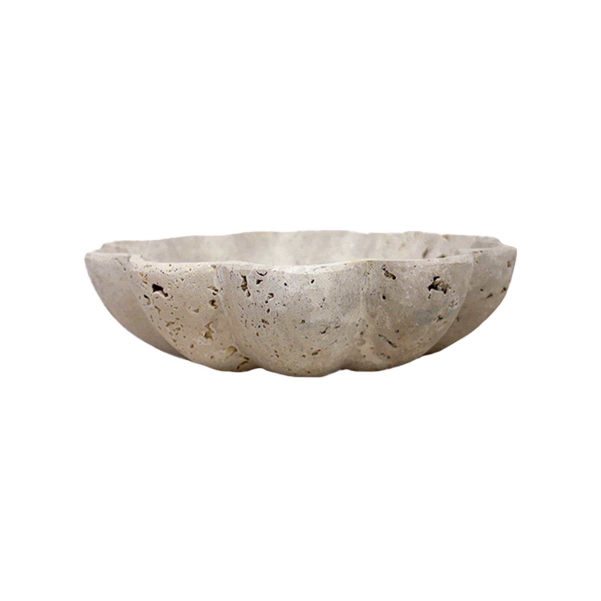 Este bowl mármore Travertino, com design redondo e elegante em formato de flor, é uma peça atemporal e exclusiva. Sua cor natural é perfeita para a decoração ou servir com sofisticação petiscos e saladas.