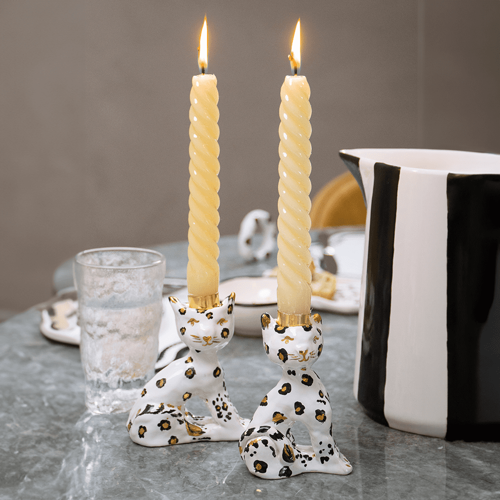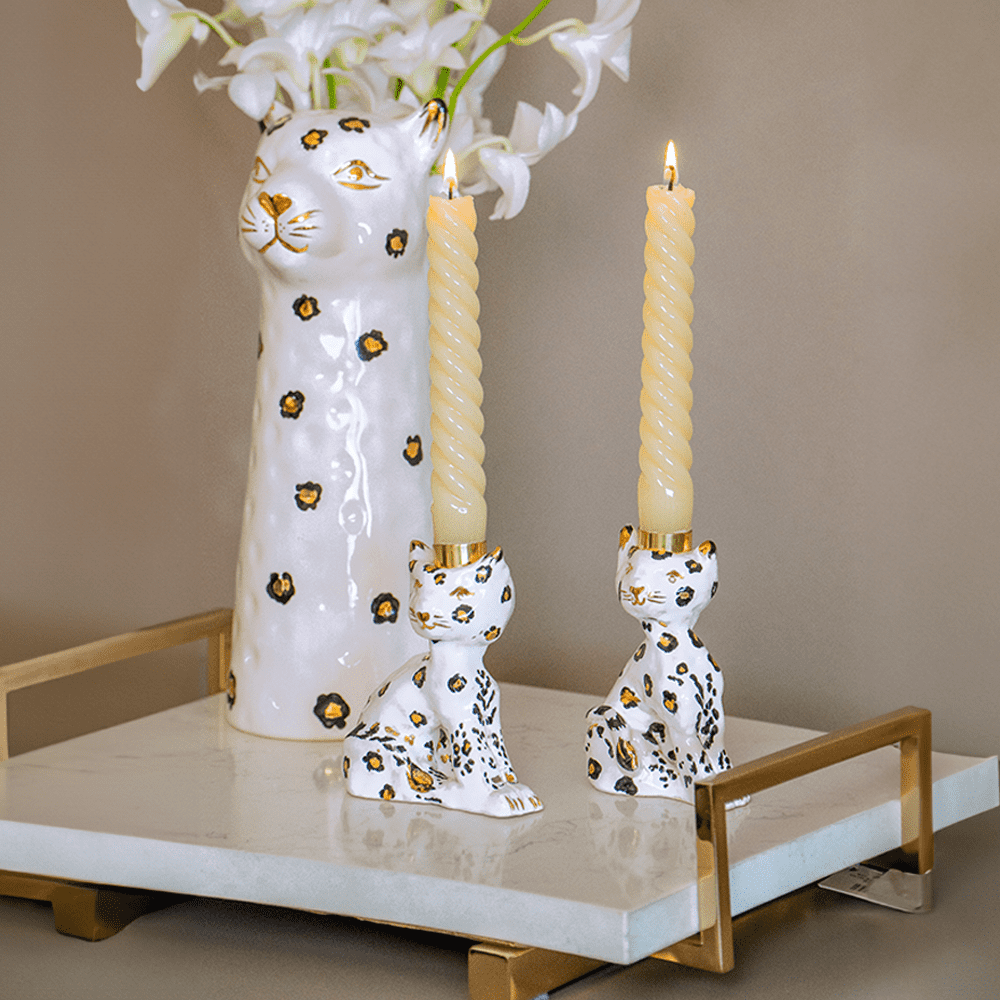 Ilumine seu ambiente com a sofisticação atemporal do Leopardo. Uma peça autoral e meticulosamente moldada à mão, não é apenas um castiçal, mas uma peça de decoração original e cheia de personalidade, que promete transformar o seu espaço. A paleta de cores em preto e branco com detalhes em ouro é chic e contemporânea. O detalhe dourado para o encaixe da vela, deixa a peça com acabamento impecável. Por ser feita totalmente à mão, uma peça é diferente da outra, torna-a ainda mais especial.
