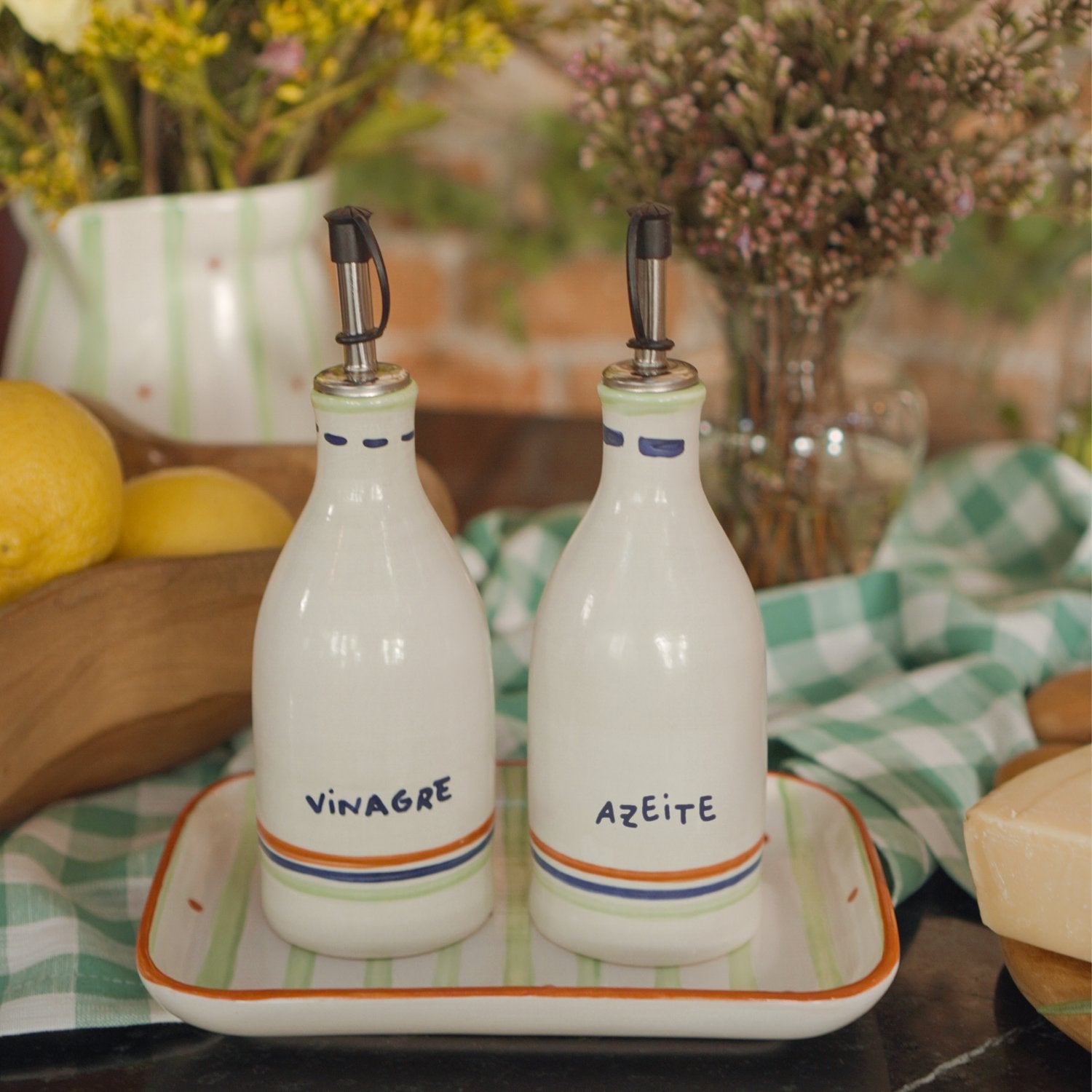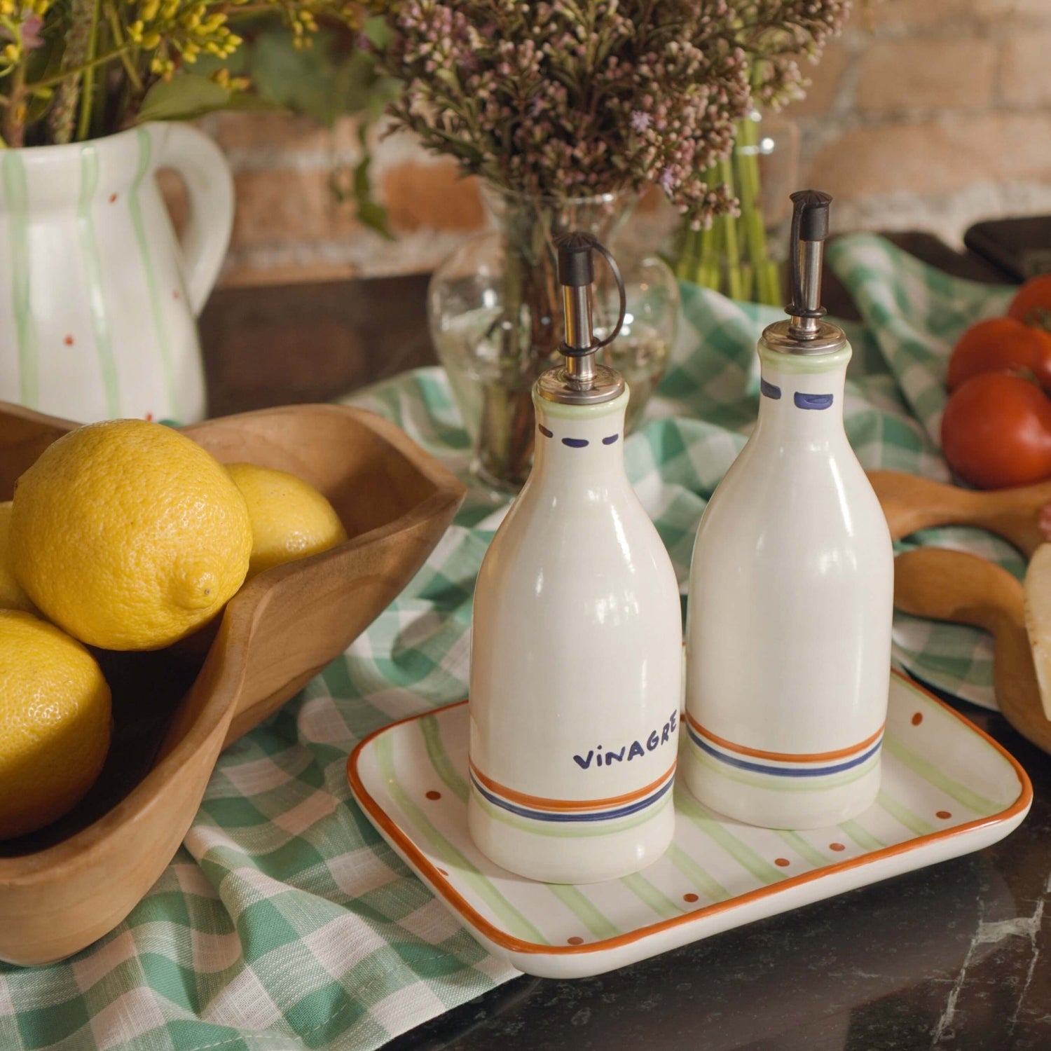 O galheteiro de cerâmica toscana é a cerejinha do bolo da coleção Toscana. Ele é feito e pintado a mão e foi desenvolvido para trazer funcionalidade para sua refeição mas sem perder o estilo e o espírito da coleção, que foi inspirada na região da Toscana, um lugar cheio de paisagens lindas e marcada pela culinária única e tradicional. A coleção junta os aspectos de simplicidade e qualidade para trazer para sua mesa a sensação de aconchego e carinho.