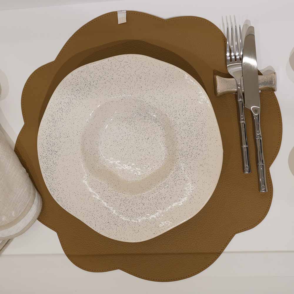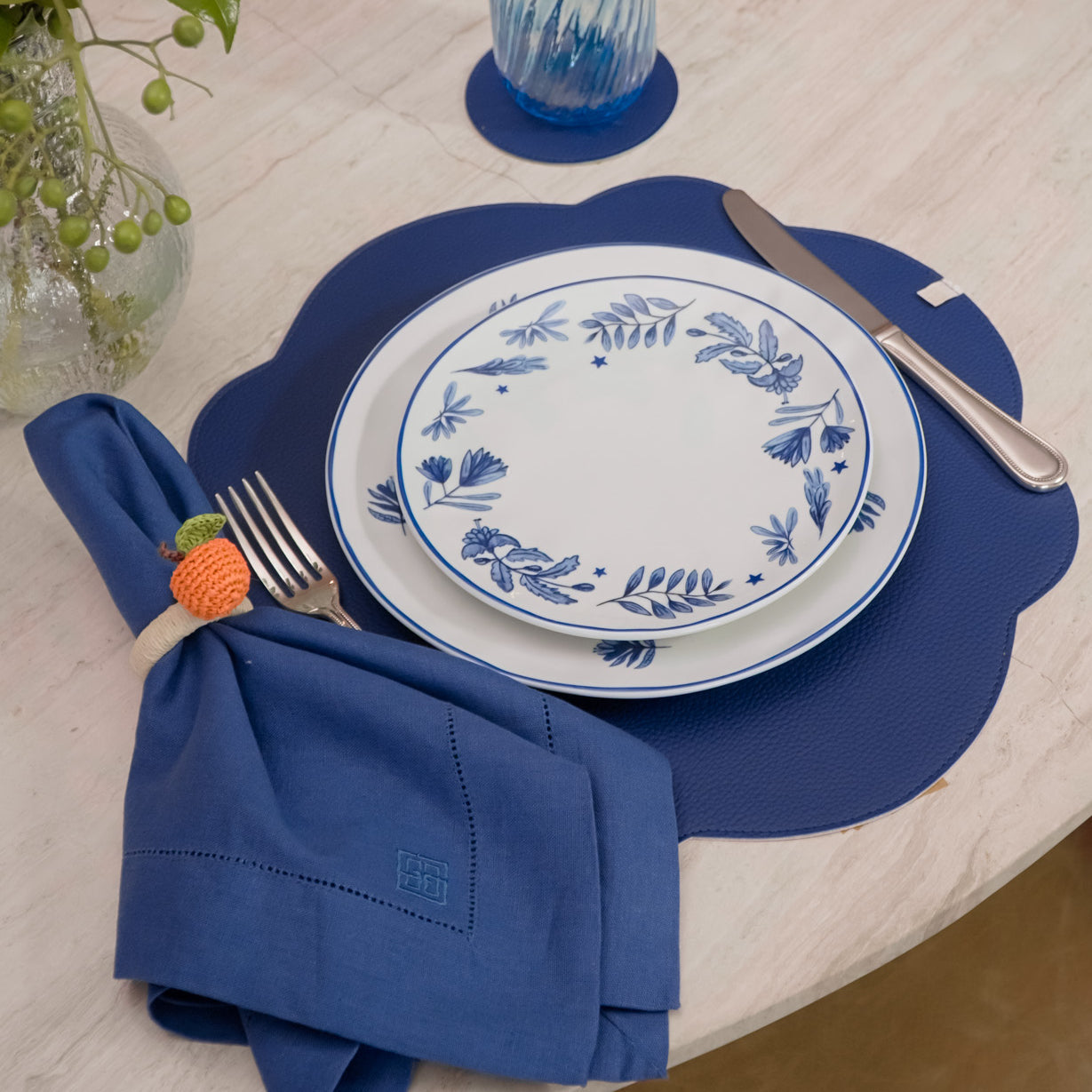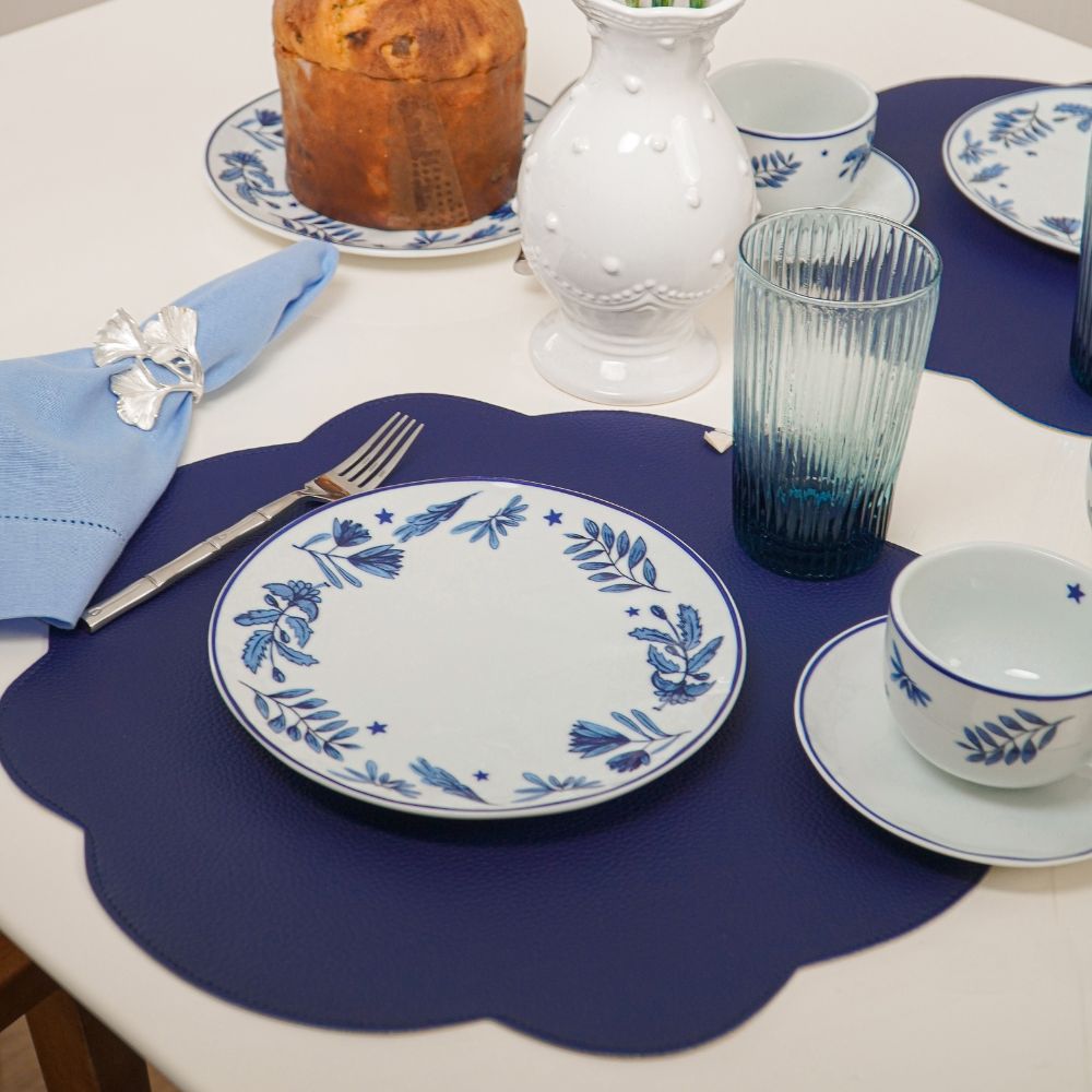 JOGO AMERICANO DUPLA FACE IMPERMEÁVEL REDONDO FLOR AZUL E CARAMELO 42 CM