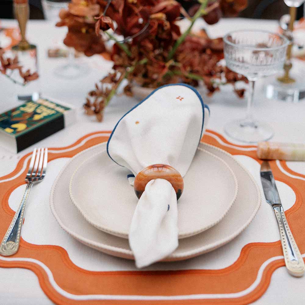 Este jogo americano de tecido retangular em algodão e linho é perfeito para sua mesa posta. A combinação de branco com a vibrante cor terracota traz um toque de modernidade e elegância.