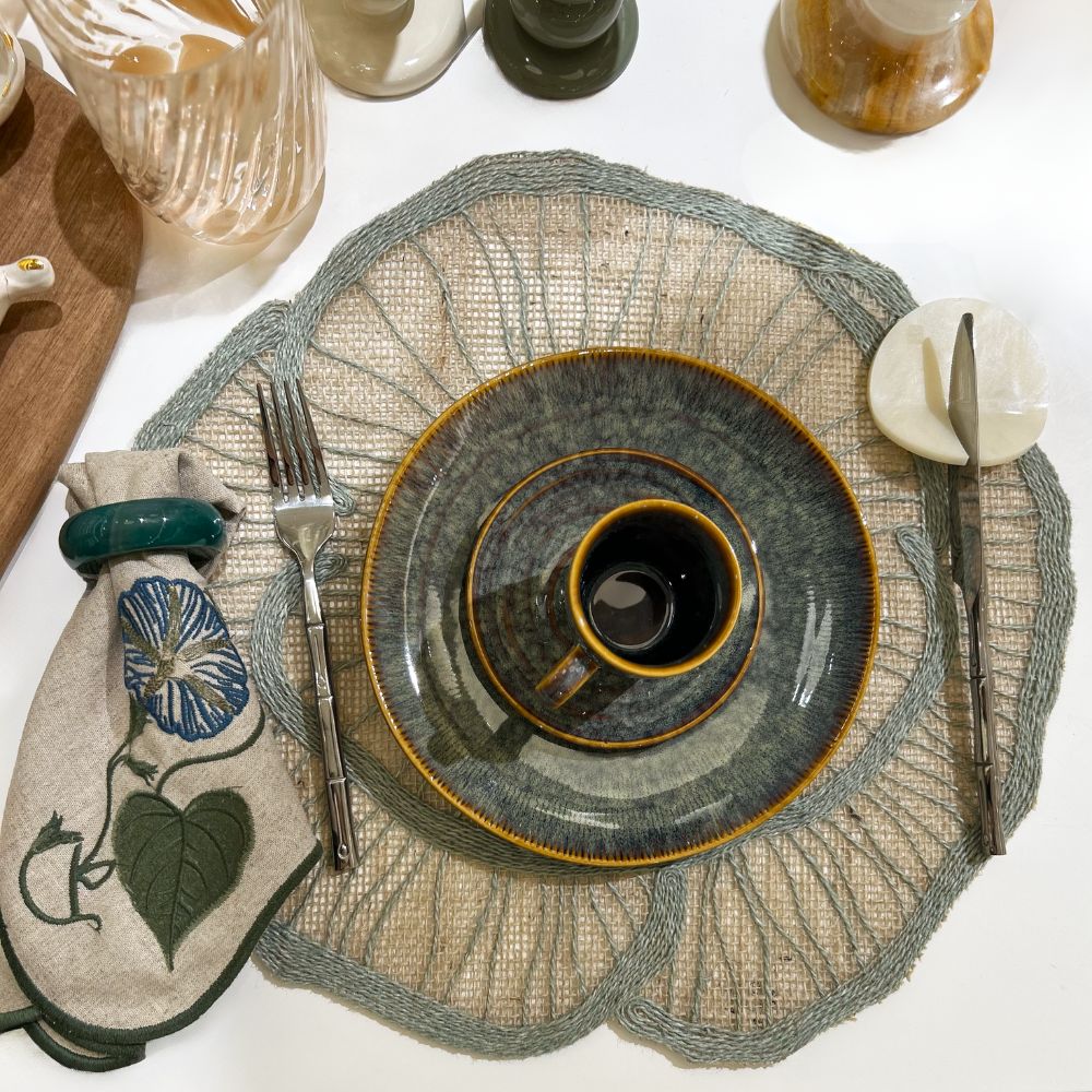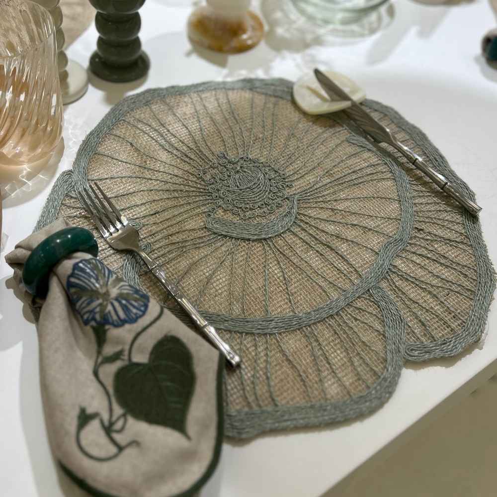 *Mesa Posta Natural: Crie um ambiente acolhedor e fresco utilizando o jogo americano Papoula Verde. Combine-o com louças em tons crus, brancos ou detalhes em madeira, realçando a beleza natural do sisal.