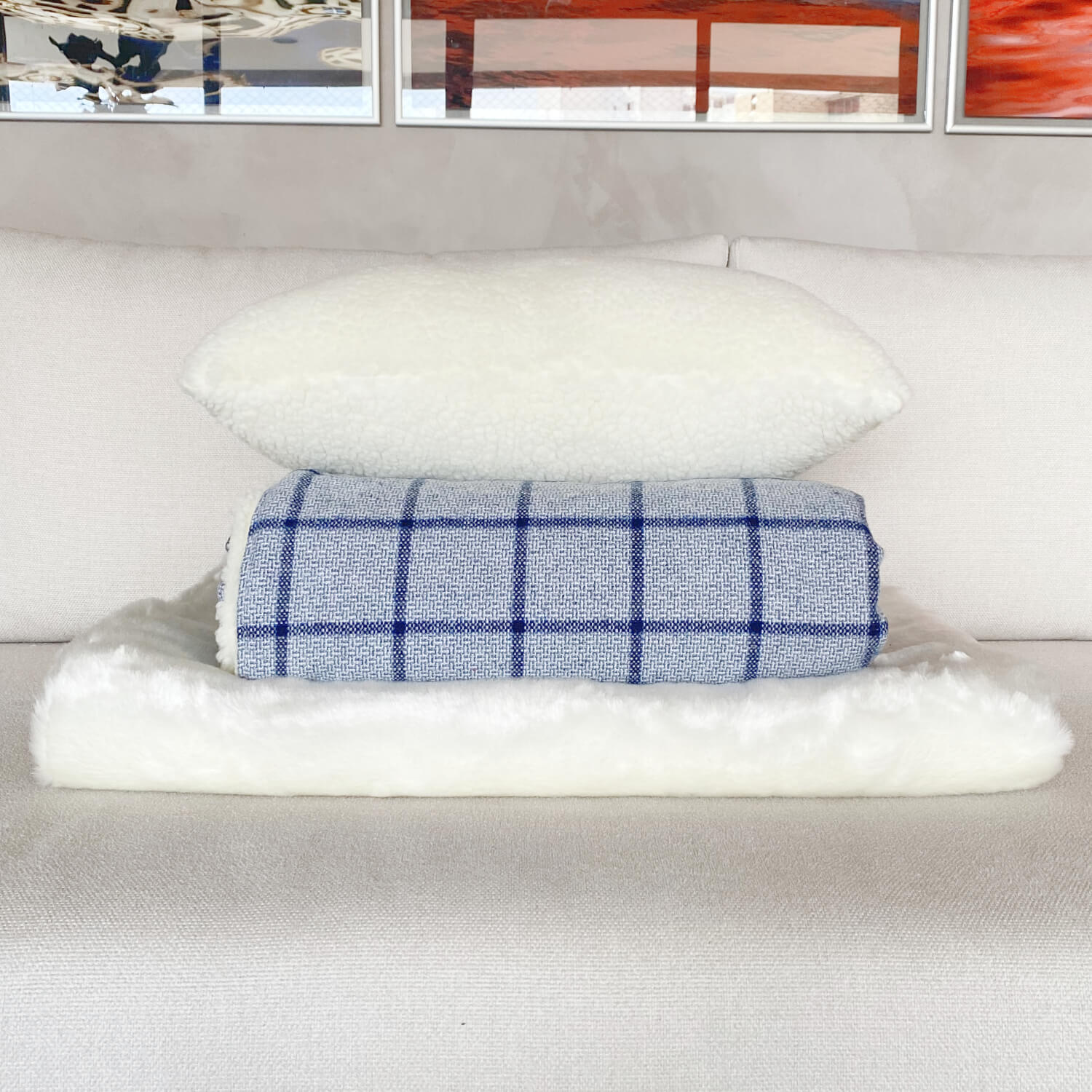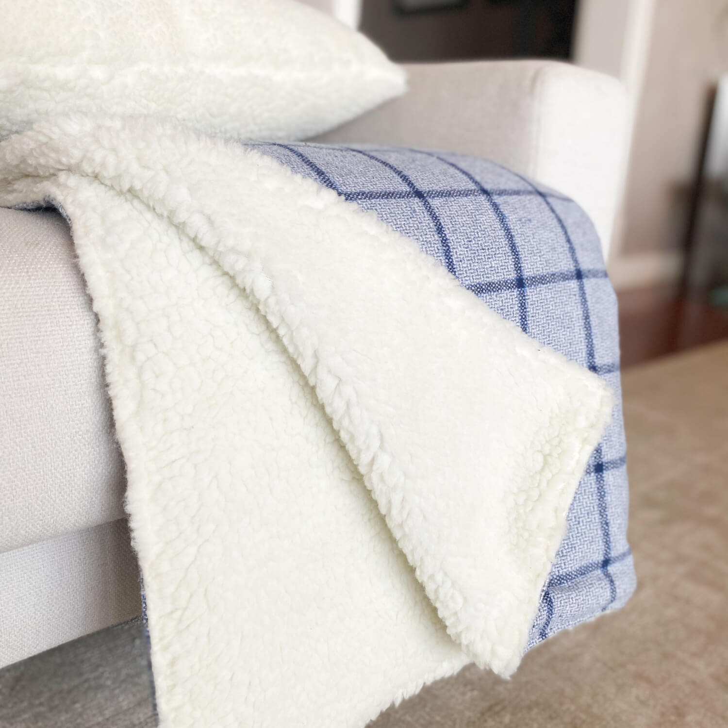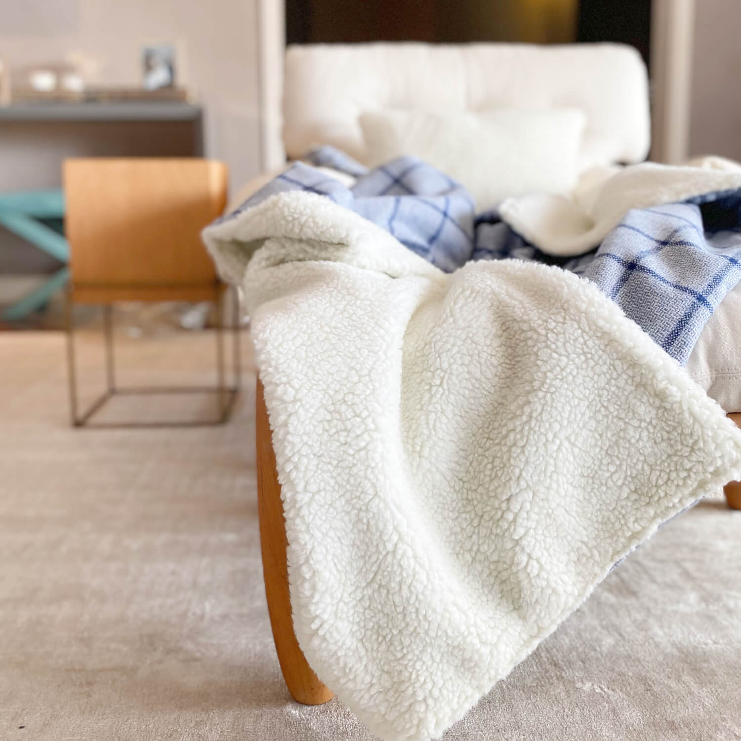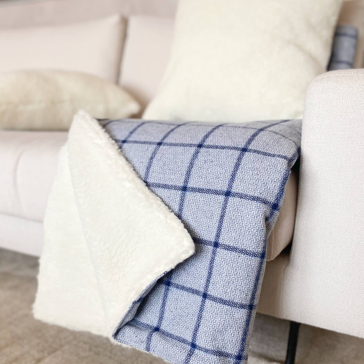 A Manta de flanela cabana tem seu forro o toque macio da pele ecológica de carneiro, e a flanela em um tom de azul bem bonito que vai ficar super despojado e moderno no sofá da sua casa, junte com a almofada de tricot plus corrente azul para uma combinação de texturas bem legal, e para o quarto a dica é usar a almofadas de pele ecológica de carneiro para compor um quarto bem aconchegante