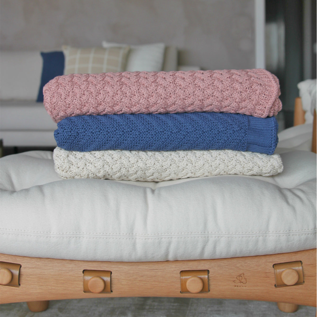 A Manta Tricot Plus Cestaria tem aspecto handmade devido ao método de tecelagem da matéria prima, em que antes de irem para a máquina, são feitos cordões com os fios que resultam em uma peça resistente, durável e com o toque macio do algodão.