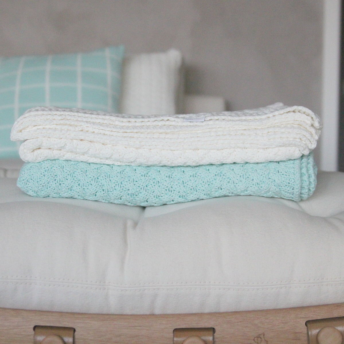 A Manta Tricot Plus Cestaria tem aspecto handmade devido ao método de tecelagem da matéria prima, em que antes de irem para a máquina, são feitos cordões com os fios que resultam em uma peça resistente, durável e com o toque macio do algodão.