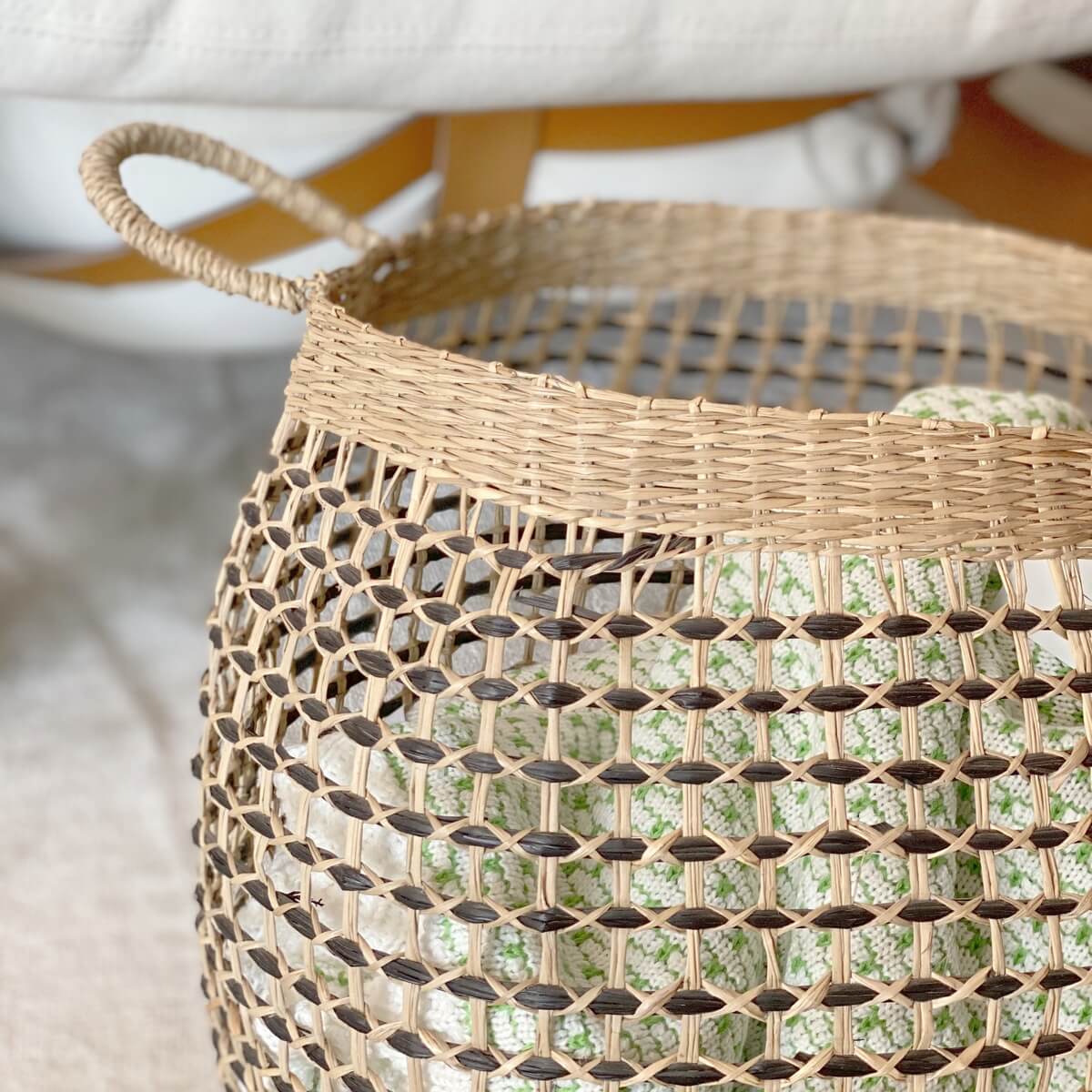 A trama mistura fios em tom de marfim com colorido (verde e azul). Perfeita para deixar em um cesto na sala, ou acomodada no sofá. Pode ser usada também em áreas externas para reuniões entre amigos no fim da tarde.