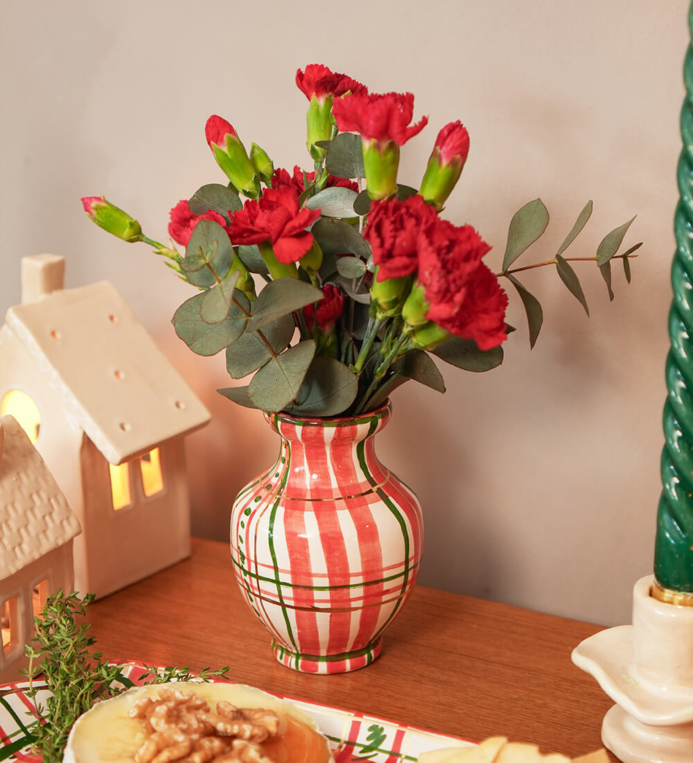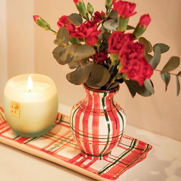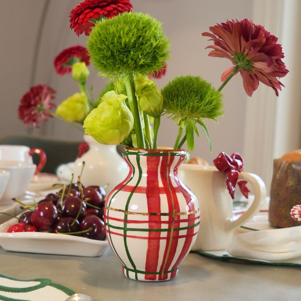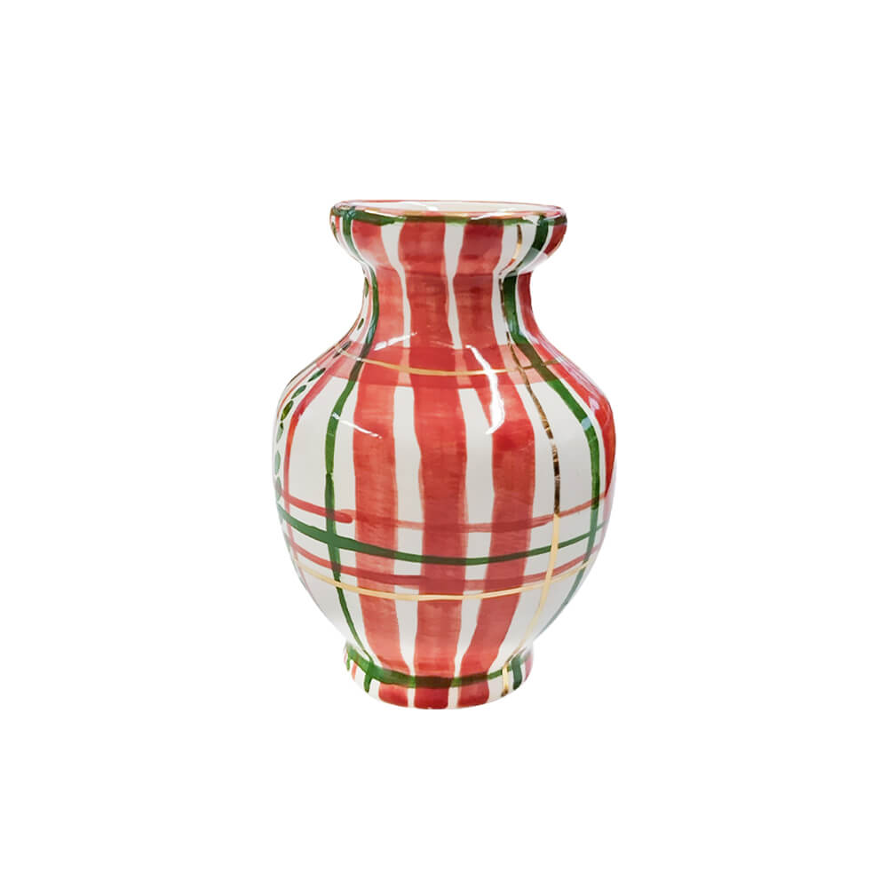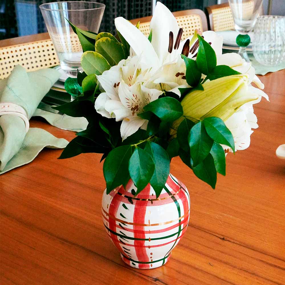 Seu design xadrez, que evoca as tradições natalinas, traz um toque aconchegante e alegre à decoração. Os detalhes em fio de ouro adicionam um charme especial, proporcionando um acabamento elegante que cria um contraste encantador. Com esse vaso, você pode dar um toque especial às suas celebrações, tornando qualquer espaço mais festivo e acolhedor.