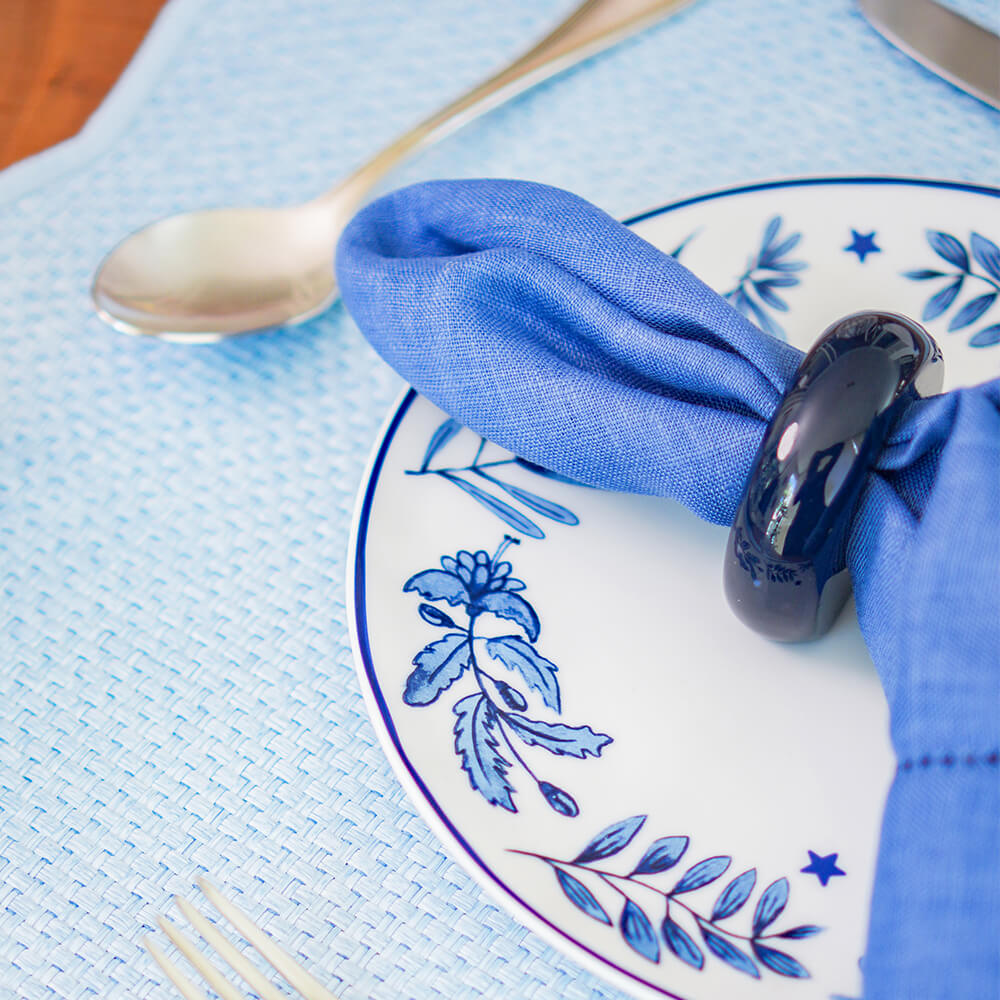 Use seu porta guardanapo Ágata com o descanso de talher da mesma coleção, complete com jogos americanos e guardanapos marfim e use uma louça com detalhes azuis e aposte em castiçais de cristal e velas azul marinho.