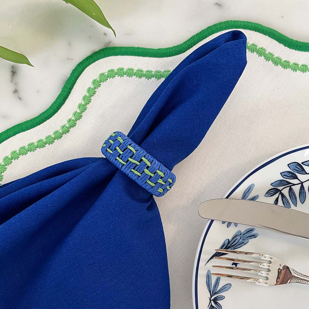 O porta guardanapo color block azul é a peça que faltava na sua mesa, em um tom de azul lindo e versátil e detalhes em verde, ele vai ser a cerejinha do bolo da sua mesa. O porta guardanapos é uma peça exclusiva Lolahome, feita de com fibras naturais trançadas e é produzida artesanalmente. Peças assim, agrega valor , pois são únicas e especiais.