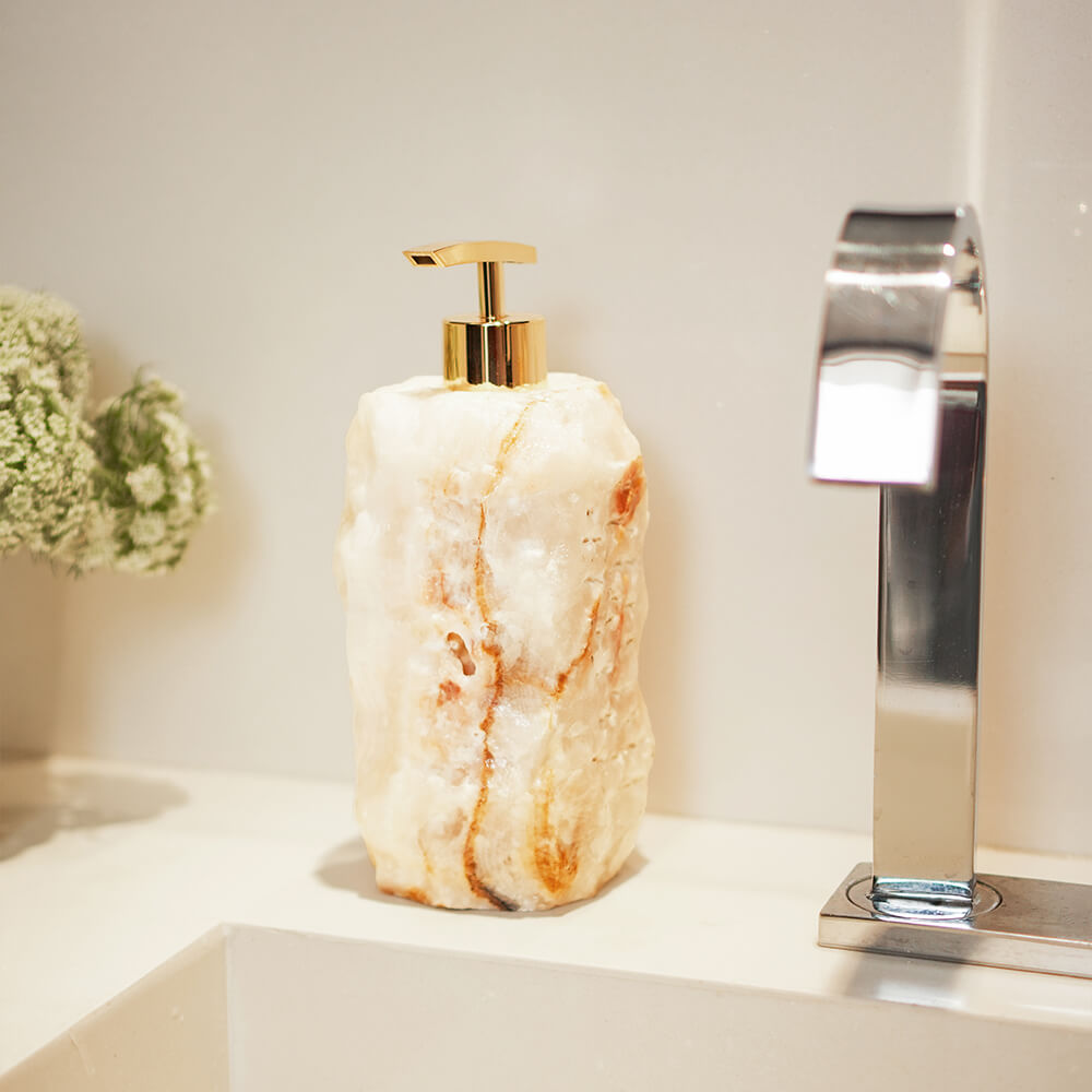 Cuidar de um dispenser de sabonete feito com pedra bruta de ônix é essencial para preservar sua beleza e funcionalidade. Para mantê-lo em ótimo estado, utilize um pano macio e úmido para a limpeza, evitando produtos de limpeza ácidos ou abrasivos que possam danificá-lo. Após a limpeza, seque bem com um pano seco para evitar a acumulação de umidade, que pode causar manchas. Mantenha o dispenser em um local seguro, longe de objetos pesados que possam quebrá-lo, e ao reabastecer o sabonete, faça isso com cuidado para evitar derramamentos. Se não estiver em uso, armazene-o em um local protegido, longe da luz direta do sol, que pode afetar sua cor e brilho. Por fim, faça inspeções regulares para garantir que a pedra não apresente fissuras ou manchas, realizando a manutenção necessária. Com esses cuidados, seu dispenser de ônix manterá sua elegância e durabilidade por muito tempo!
