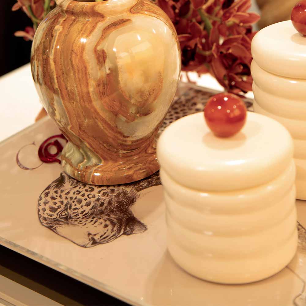 Produzida artesanalmente, cuidadosamente pintada à mão e com detalhes distintos da pedra Ágata natural. A coleção carrega cores vibrantes e tambem naturais, iluminando qualquer ambiente