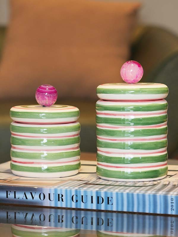 Este Pote de Cerâmica Artesanal, verde e rosa, possui Design Único Lolahome, realçado pela beleza da pedra de Ágata. É a peça ideal para adicionar um toque sofisticado e atemporal à sua decoração