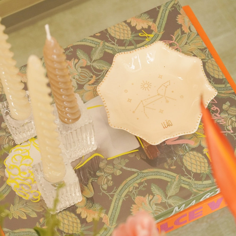 O pratinho de cerâmica é a pedida certa para deixar tudo mais divertido. Ele é feito em um formato orgânico e o desenho da constelação e os detalhes da borda são feitos em ouro.