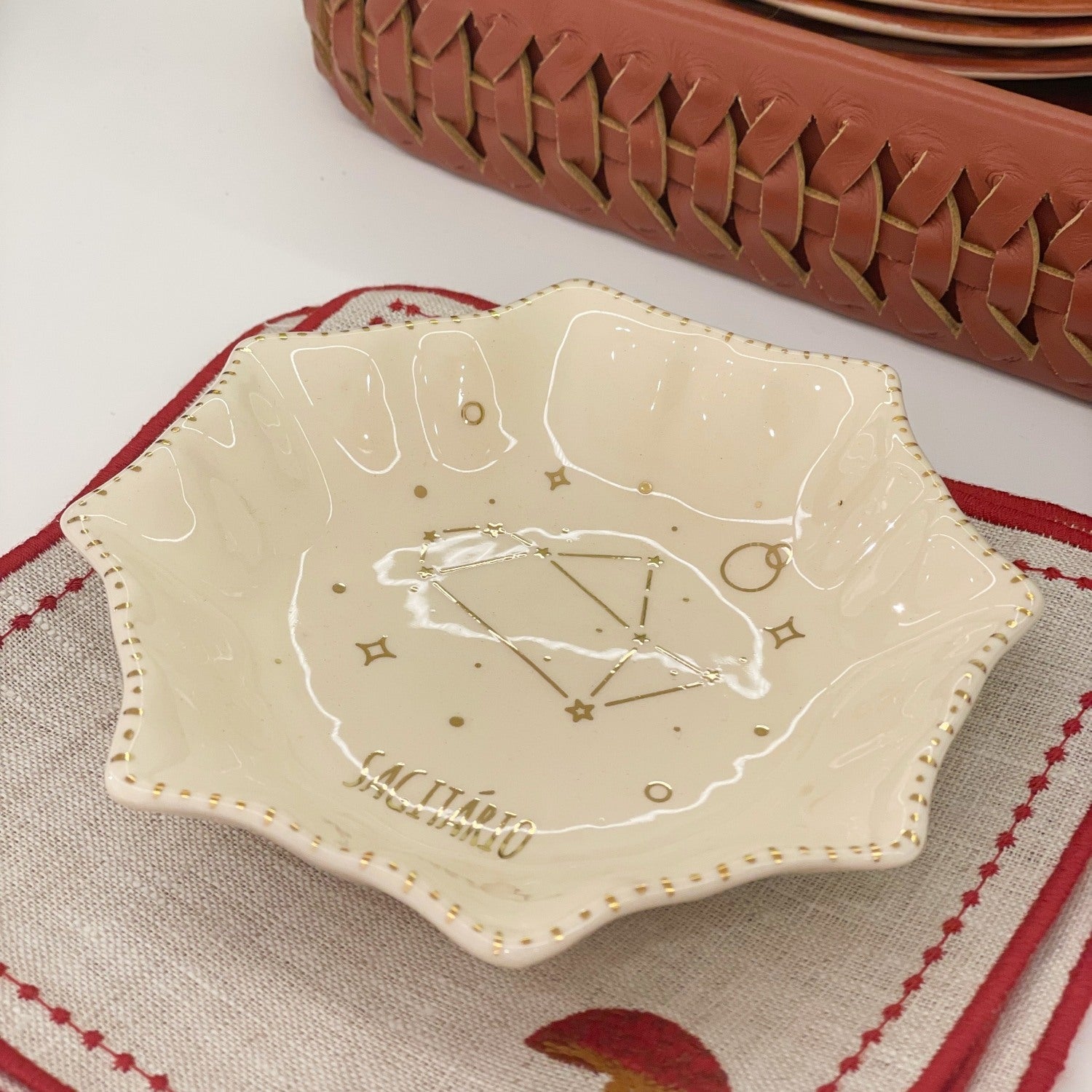 Para a decoração, peças cheias de personalidade como o pratinho signos são essenciais. Ele é feito de cerâmica e tem formato orgânico, além de que a constelação estampada e os detalhes da borda são feitos em ouro.