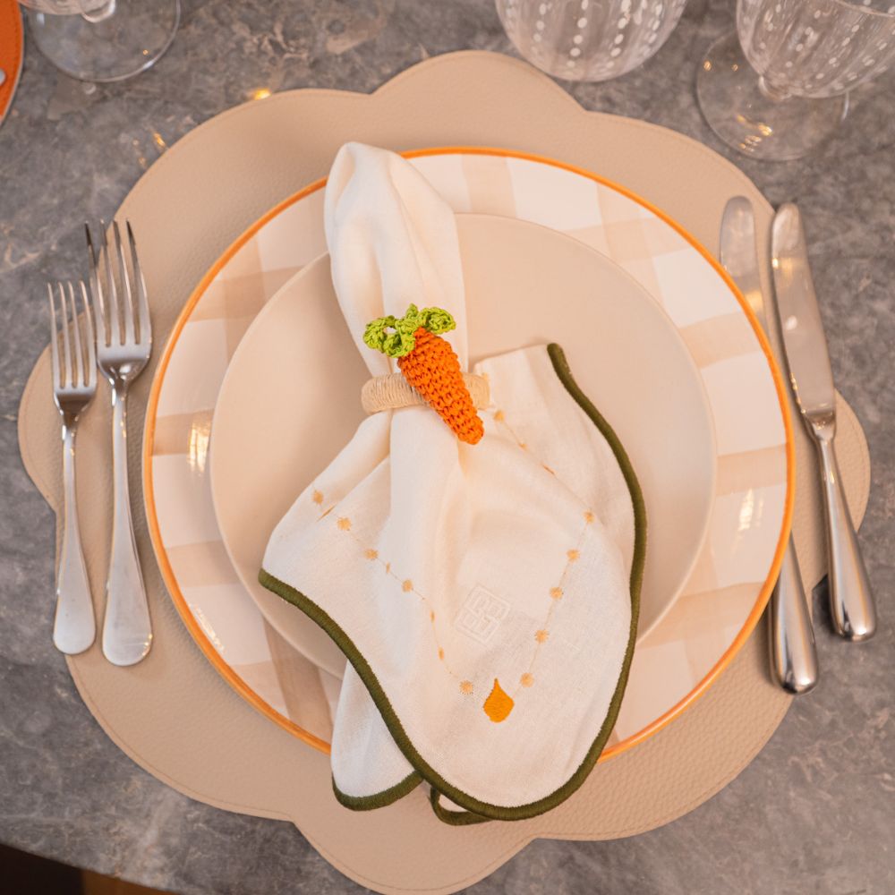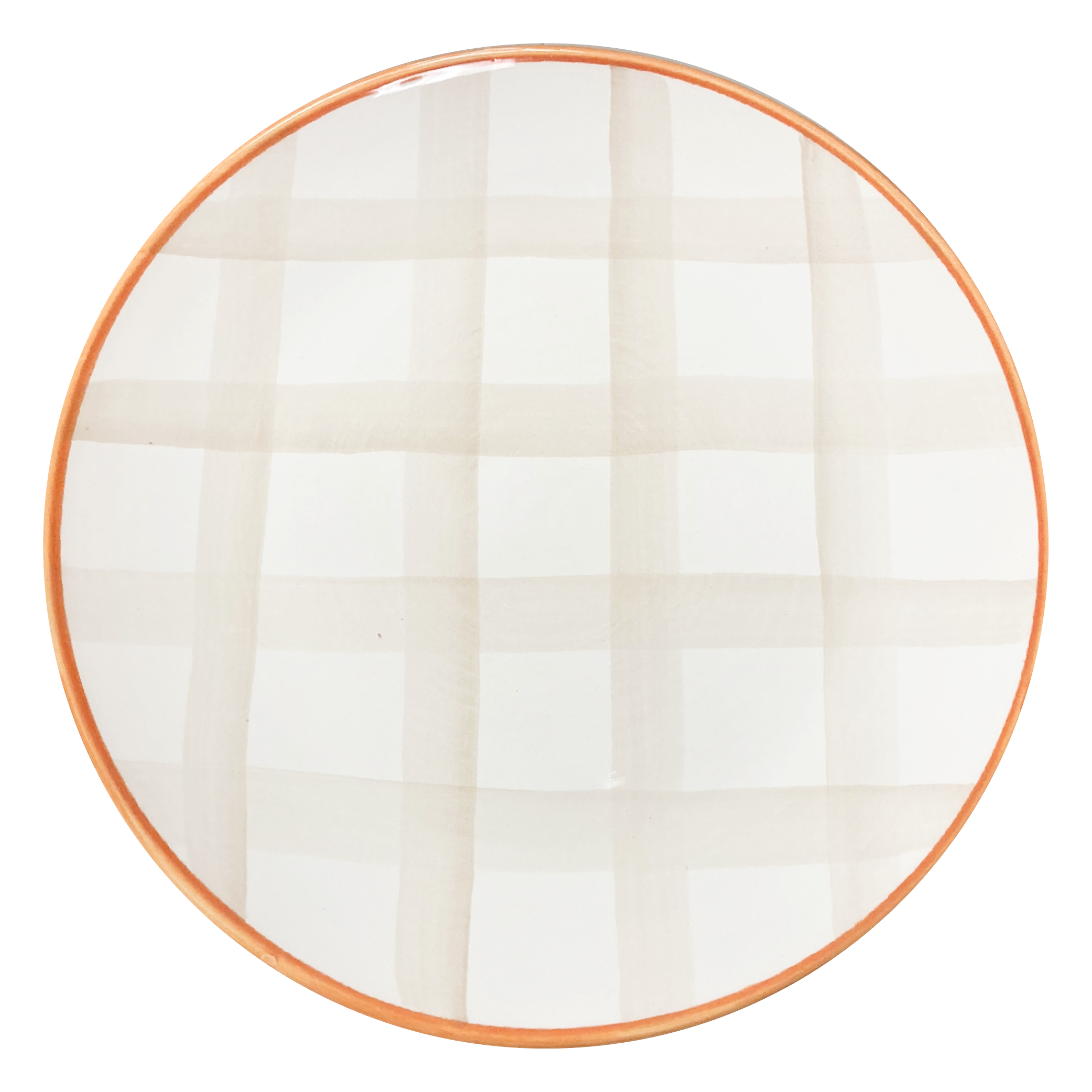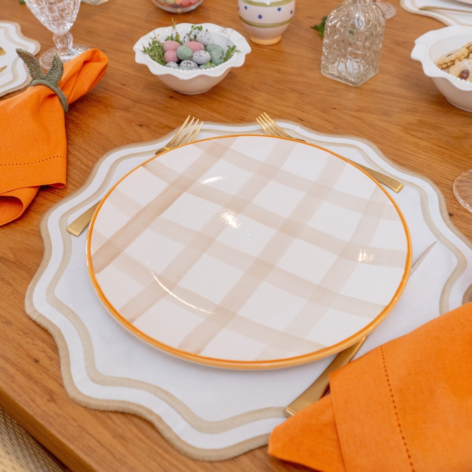 A mesa posta é uma forma de demonstrar carinho e cuidado com você e com que estiver ao redor da mesa, por isso, peças de qualidade e exclusivas fazem toda a diferença na hora de surpreender. Pensando nisso, a Lolahome desenvolveu o prato vichy bege, uma peça única e que carrega personalidade e estilo, já que são feitas 100% artesanais. Suas tramas xadrez são feitas em um tom de bege e suas bordas laranja.