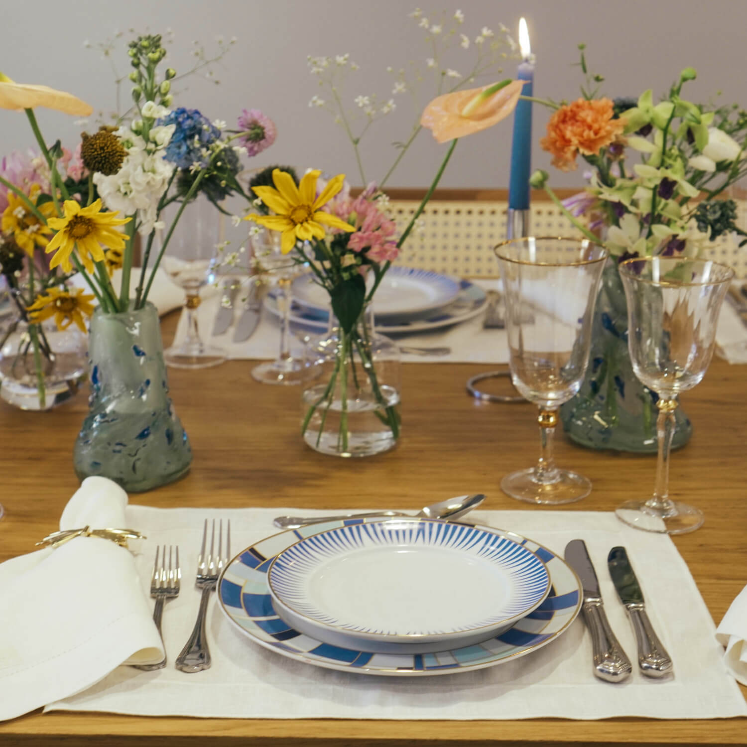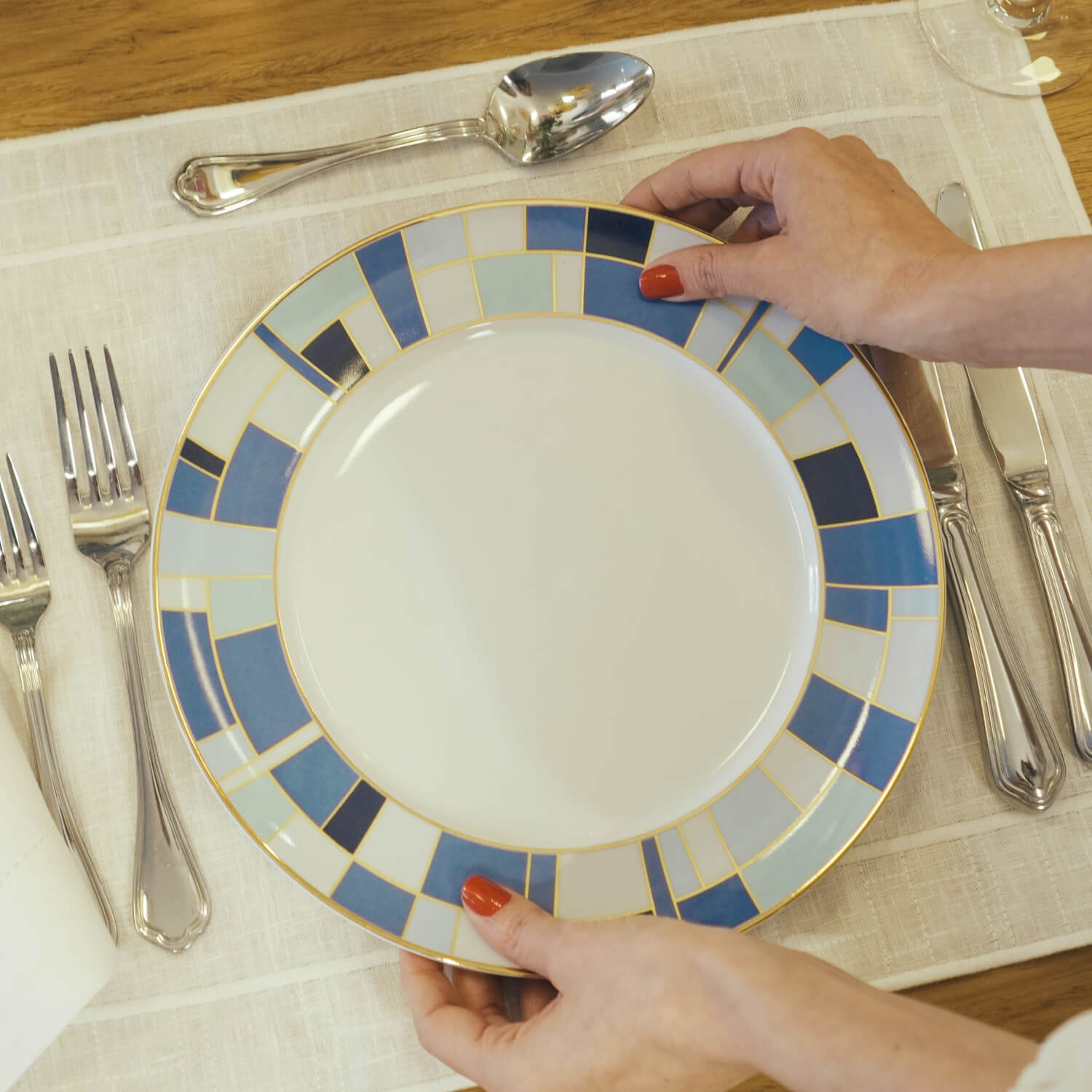 Com vários nuances de azul, a Coleção Gold Déco foi desenhada para abrilhantar momentos de celebração. Iluminados pelos frisos de ouro a composição se torna chic e suave